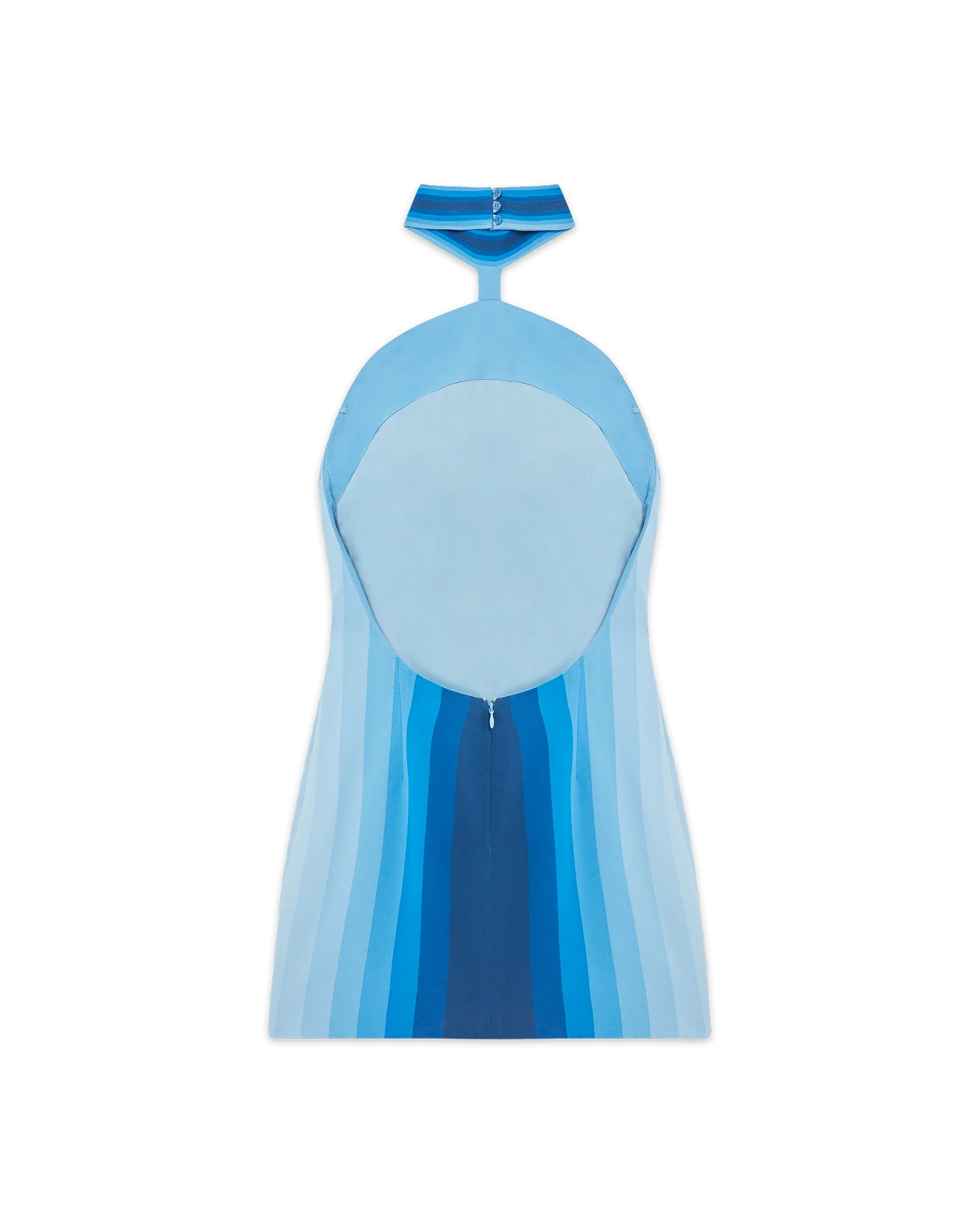 The Arch Gradient Cady Dress is a shift-style mini dress featuring the seasonal arch print of the season in a nighttime colourway of light and dark blues. Finished with a straight hemline. open back. neck button closure and contrast lining.