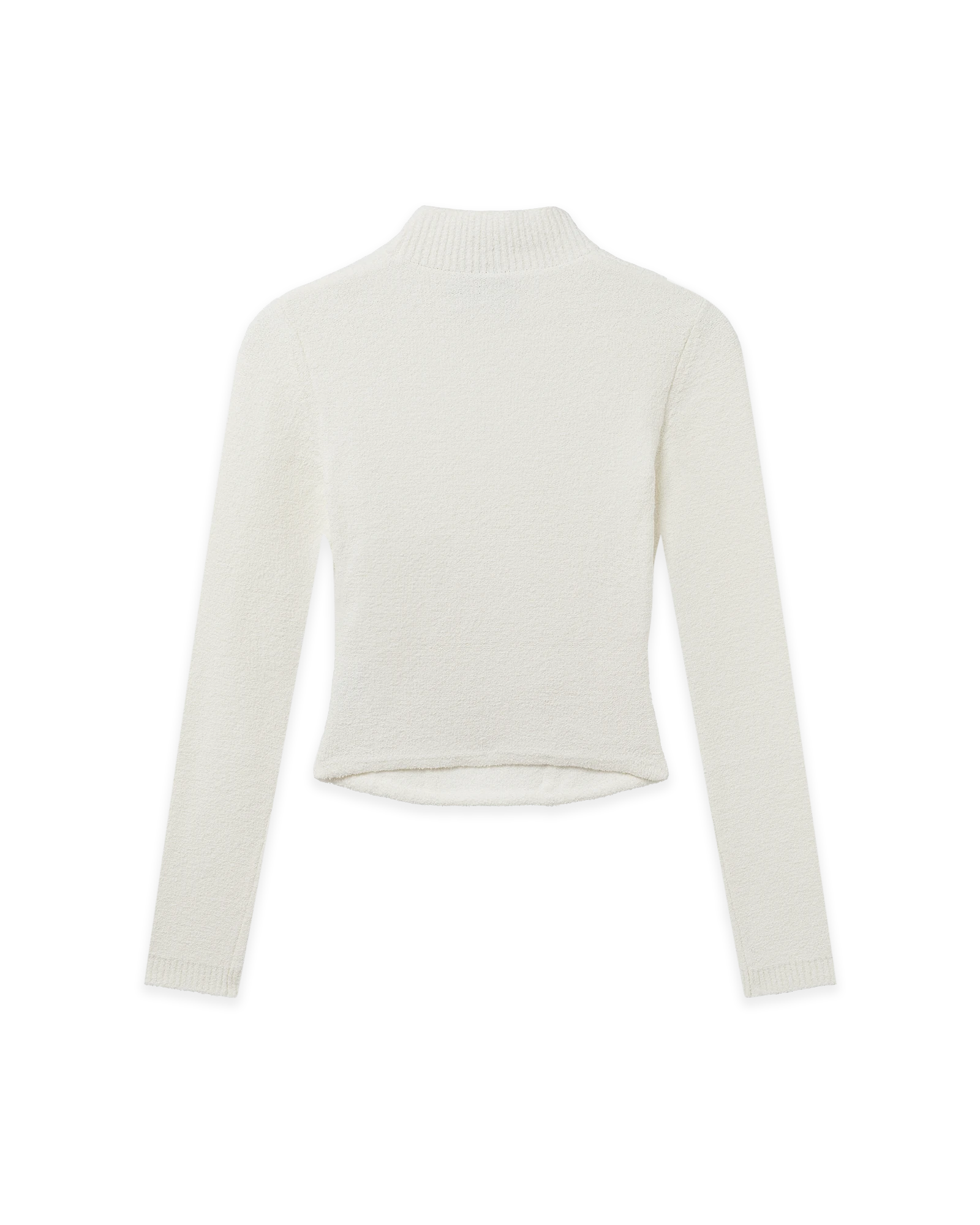 The boucle bustier top is a long-sleeve fitted design featuring the house’s signature diamond logo crafted from a cotton blend boucle fabric. Completed with decorative corset seam lines. an internal corset support layer. and a polo neck.