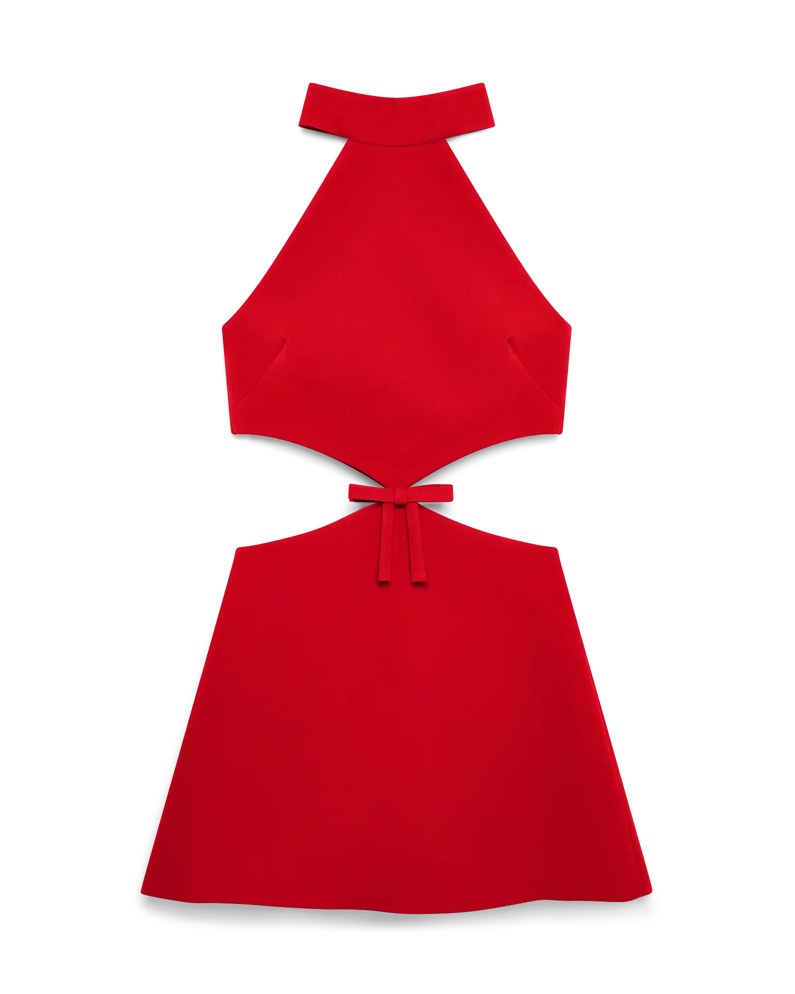 The cut-out dress is a sleeveless. A-line mini design featuring cut-out sides. Completed with zip closure. a halter neck with a band collar. and bow detail at the waist where the fabric tapers.