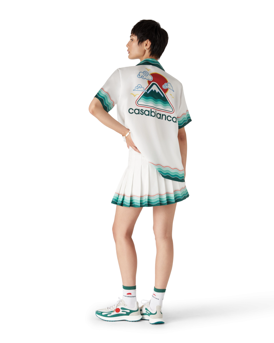 The Danse De La Mer silk shirt is a long-sleeve all-over printed design featuring hand-painted scenes created especially for the collection and crafted from silk fabric. Completed with button closure. interlocking CC logo corozo buttons. signature gold rim enamel buttons. and Memphis wave-inspired design element stripe details on the hem. cuffs. collar and placket.