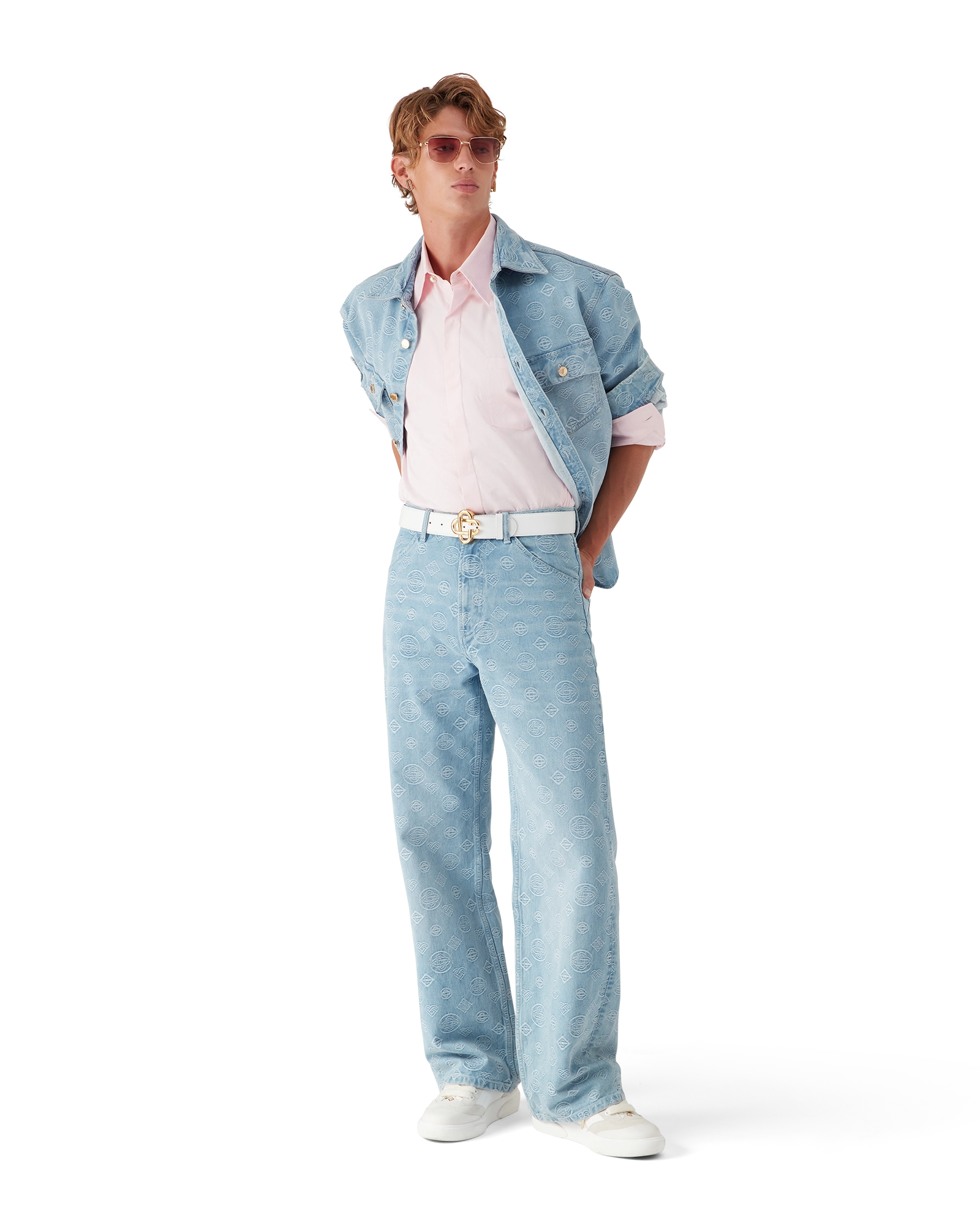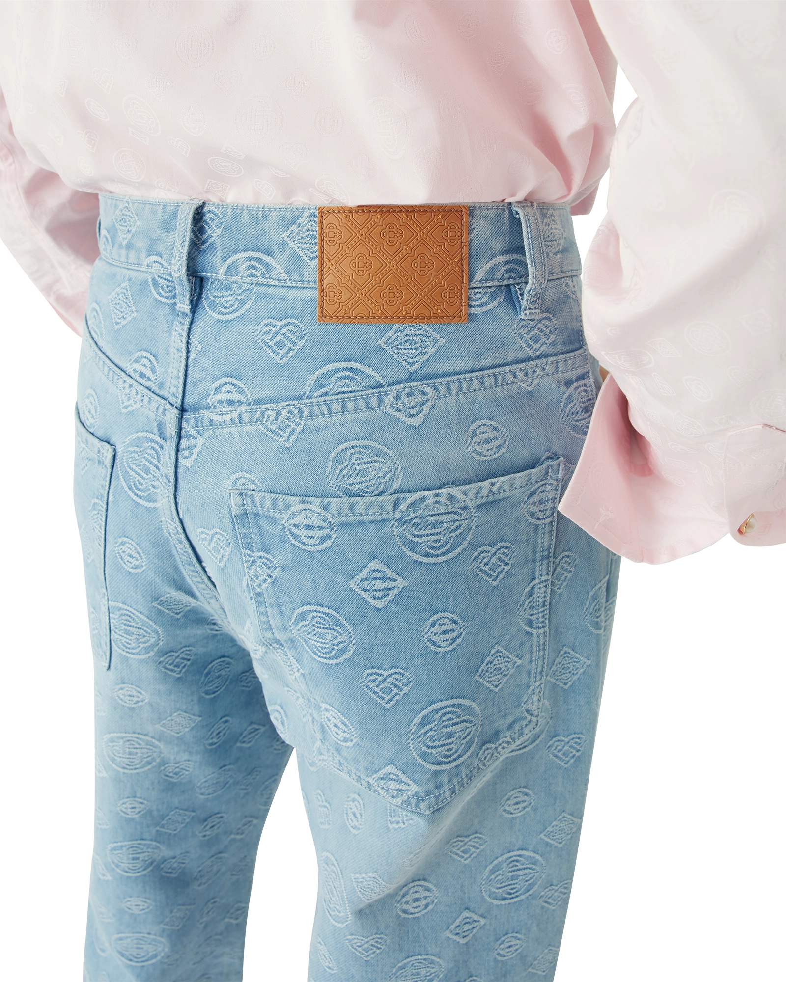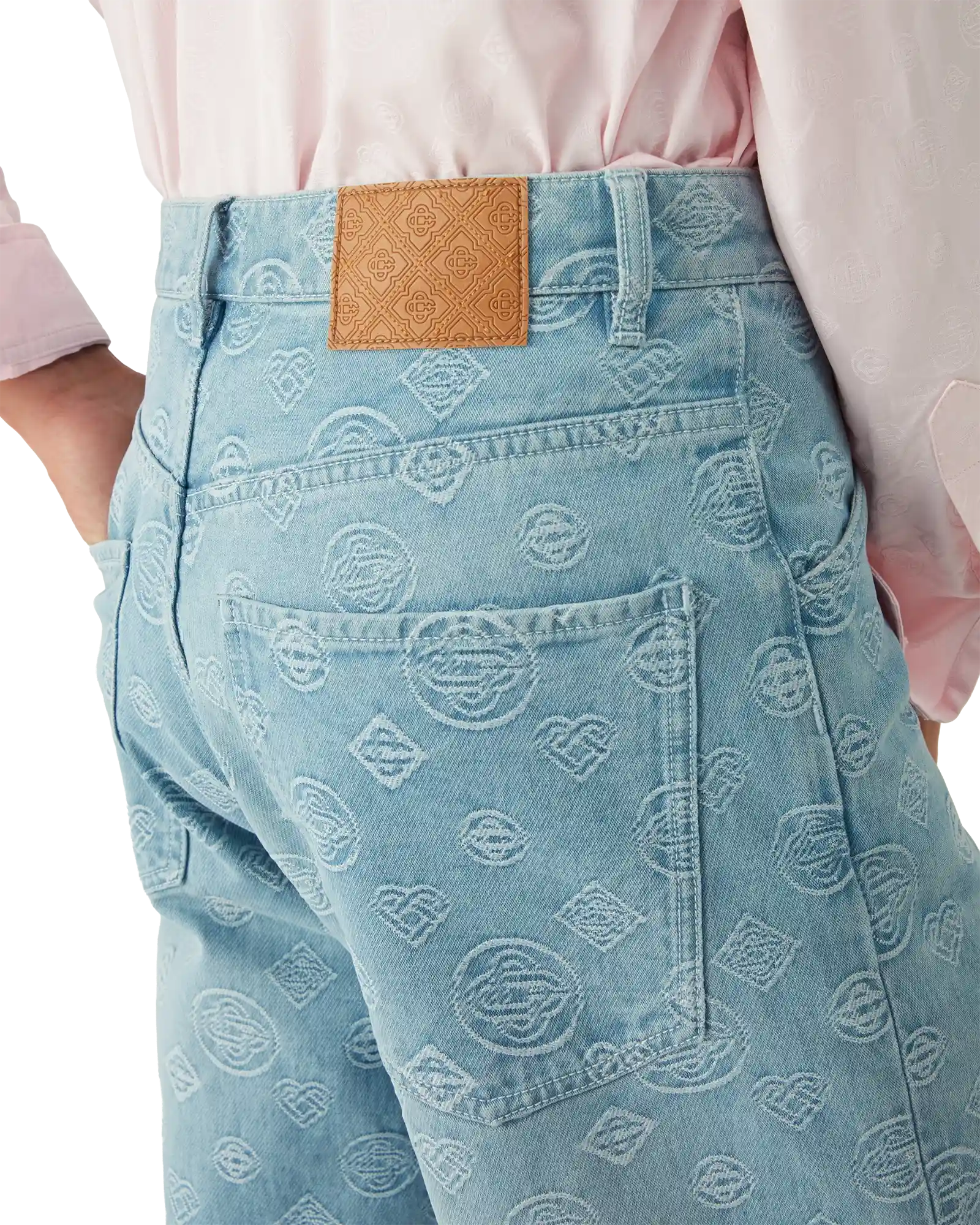 The denim monogram relaxed fit jeans are a straight-leg classic design featuring the house’s Honeydew logo repeat. This repeat differs from our other monograms. as it combines unique shapes to form a cohesive pattern. Completed with belt loops. zip closure. slanted pockets. back patch pockets. and gold-plated hardware.
