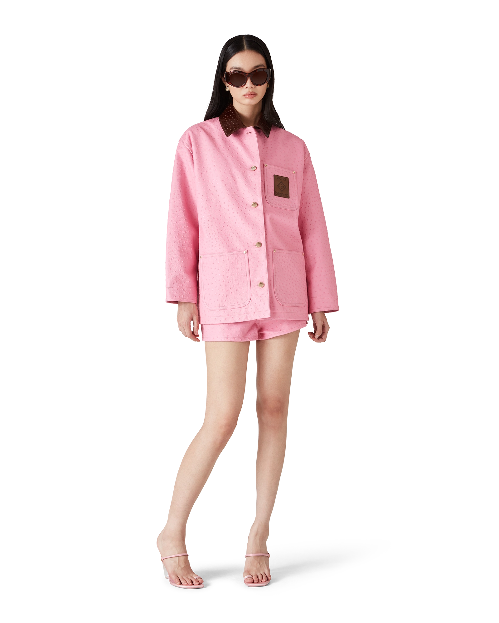 The Embossed leather workwear coat is a relaxed. laid-back design crafted from Italian calf leather. Completed with an ostrich-effect printed pattern. a contrast collar. a breast pocket with a branded leather patch. front patch pockets. button closure. and gold-plated hardware.