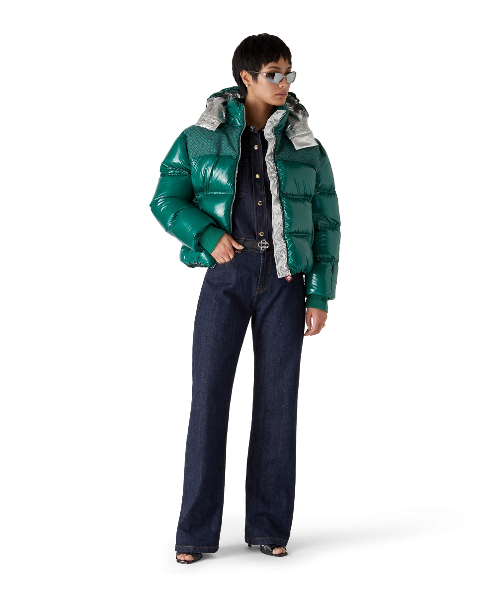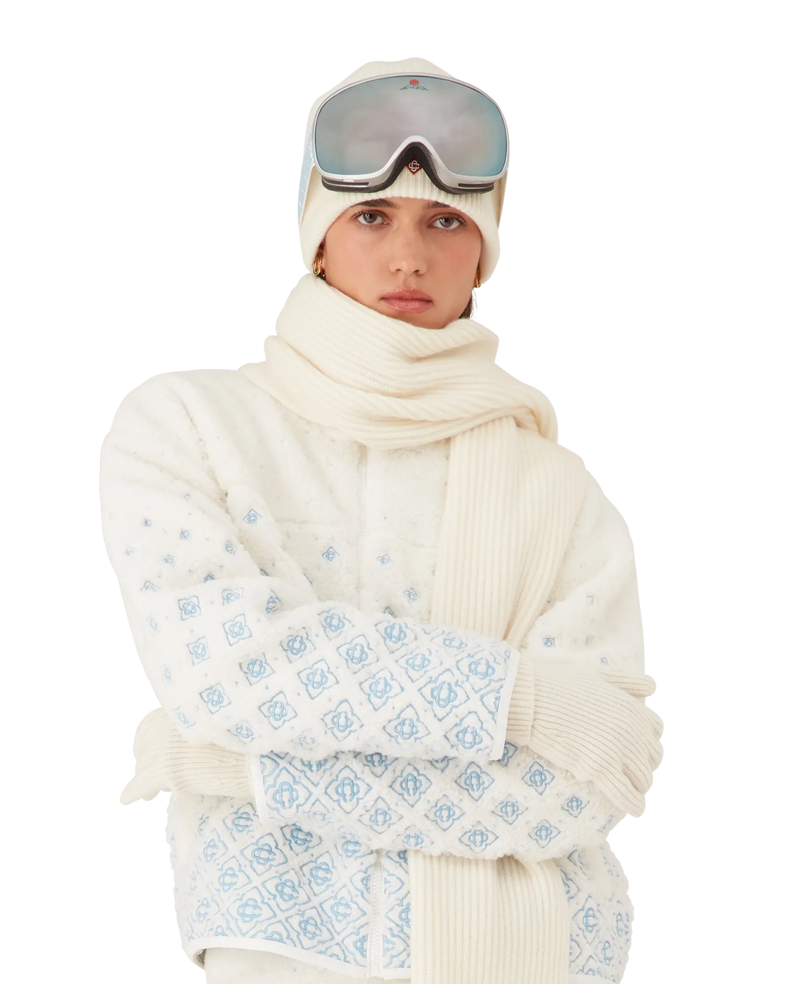 The embroidered gradient monogram cropped fleece jacket is a refined outerwear design crafted from technical fleece fabric in white. inspired by plush textures of Japan’s legendary powder snow. Drawing from inviting comfort of traditional countryside life where steaming hot springs offer respite from winter’s cold and soft snowfall muffles the world. This style features the house’s signature monogram artwork. complete with front zip closure and silver-hardware toggle.