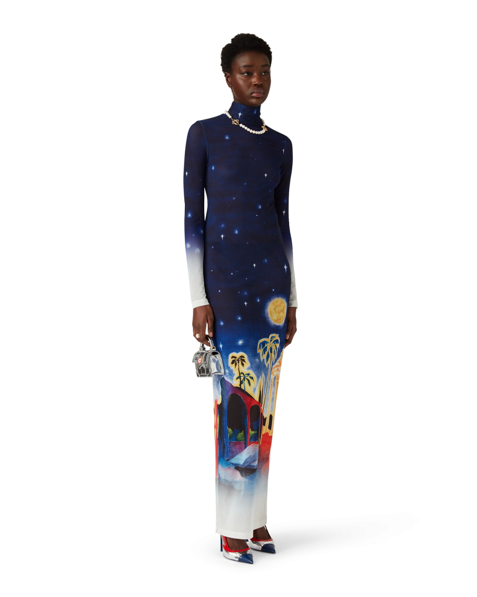 The Galactic Connection mesh short-sleeve dress is a printed design crafted from a mesh fabric featuring the house’s seasonal airbrush artwork – inspired by Pater Sato; with Galactic Connection we explore who the Casablanca bionic beings would be. while still keeping the mountain elements in the background. Completed with a classic crew neck.