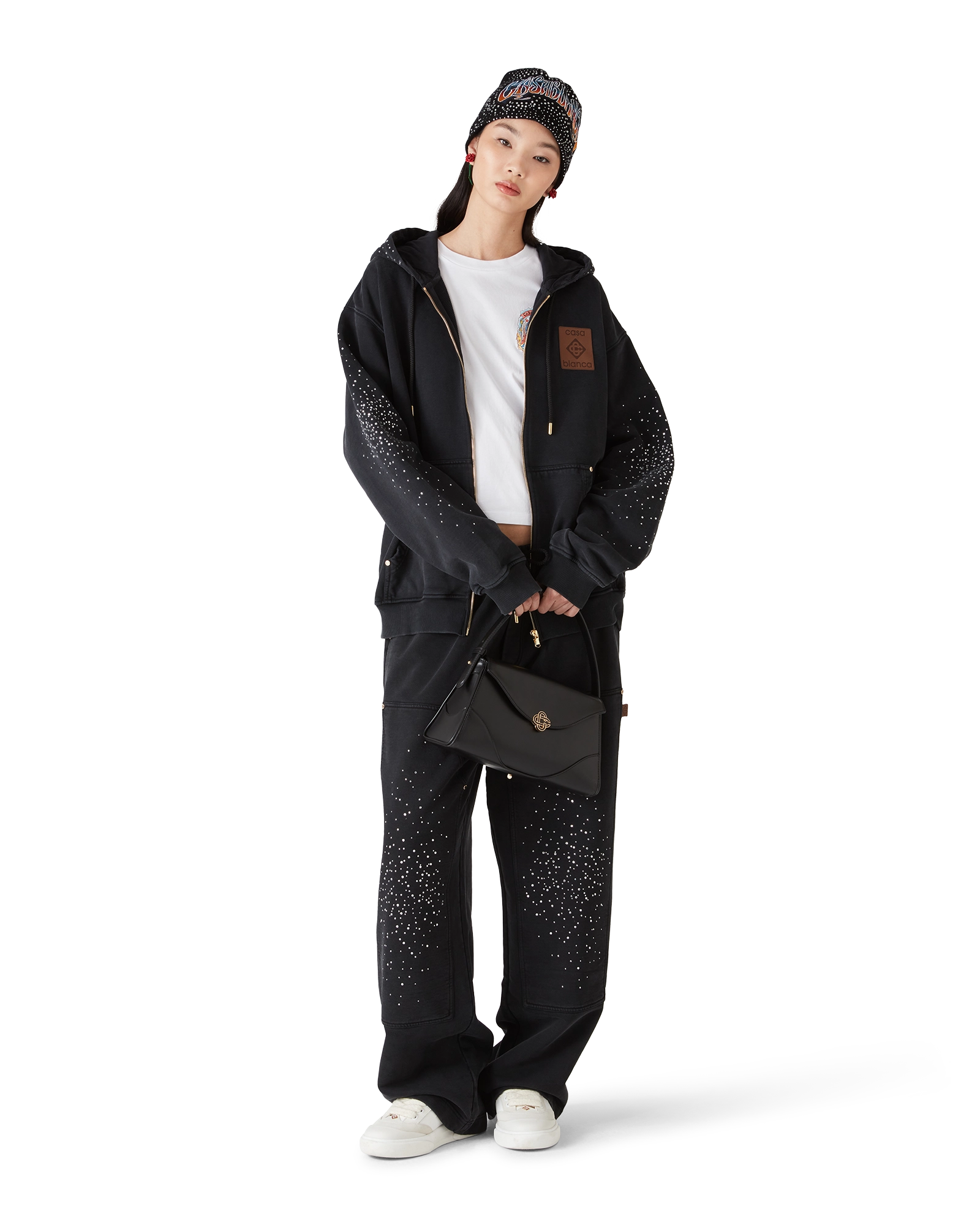 The gothic crystal embellished beanie is a woven design crafted from wool fabric and crystal beading detail. Completed with embroidered hand-drawn typography of the Casablanca logo. inspired by the gothic typeface used in tattoos.