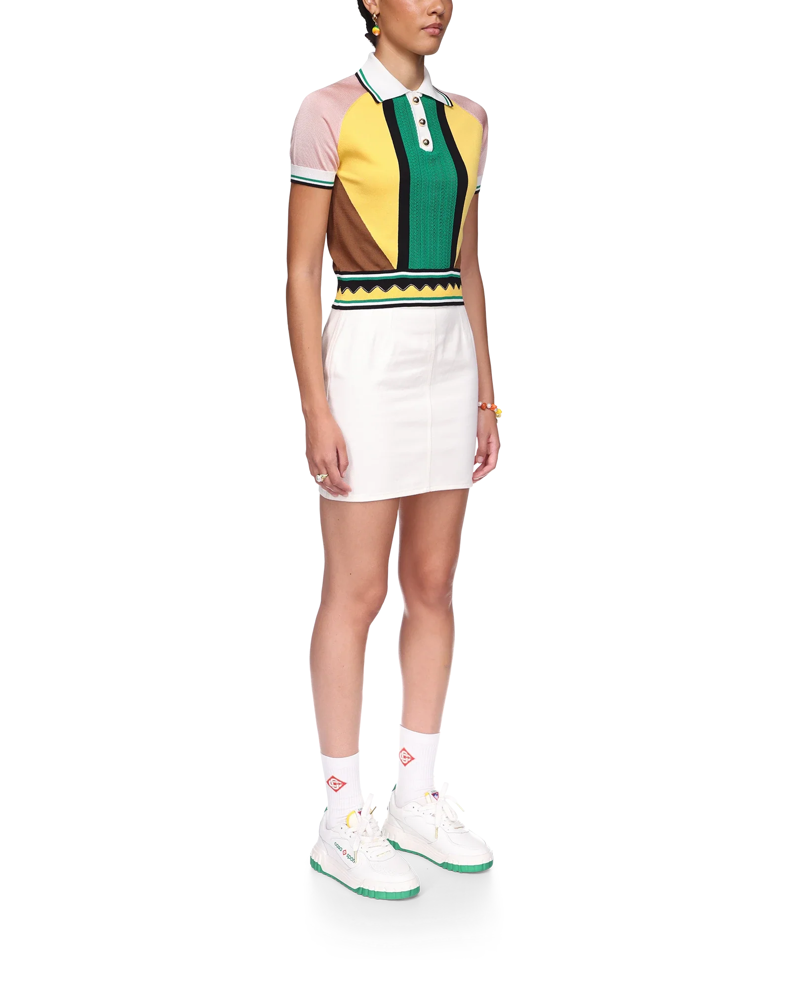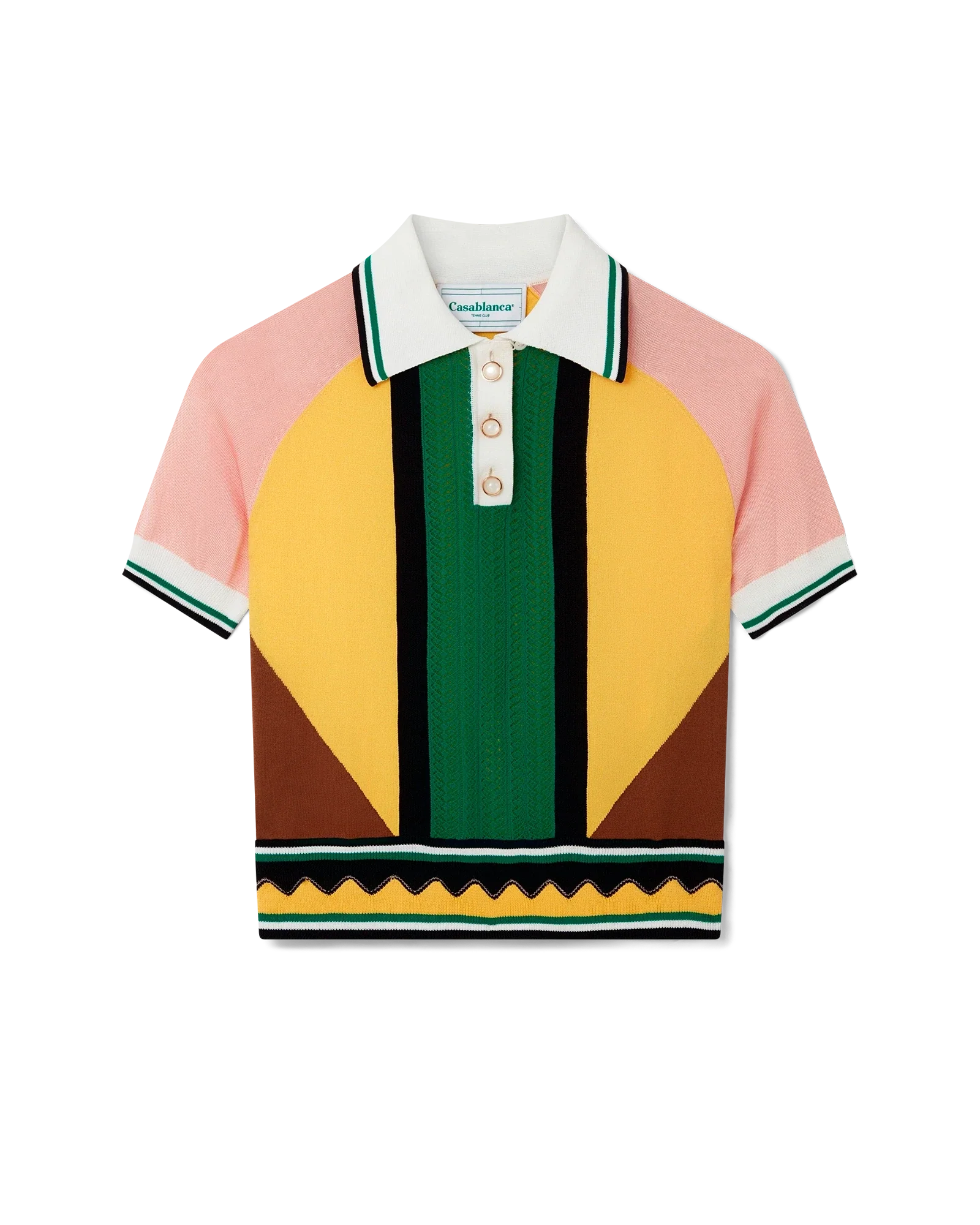 The graphic panelled polo is a raglan-style short-sleeve design inspired by Nigeria and features the colours of the country’s flag. Completed with colour block panels. the house’s signature gold rim pearl buttons. rib collar. cuffs. and hem with striped details.