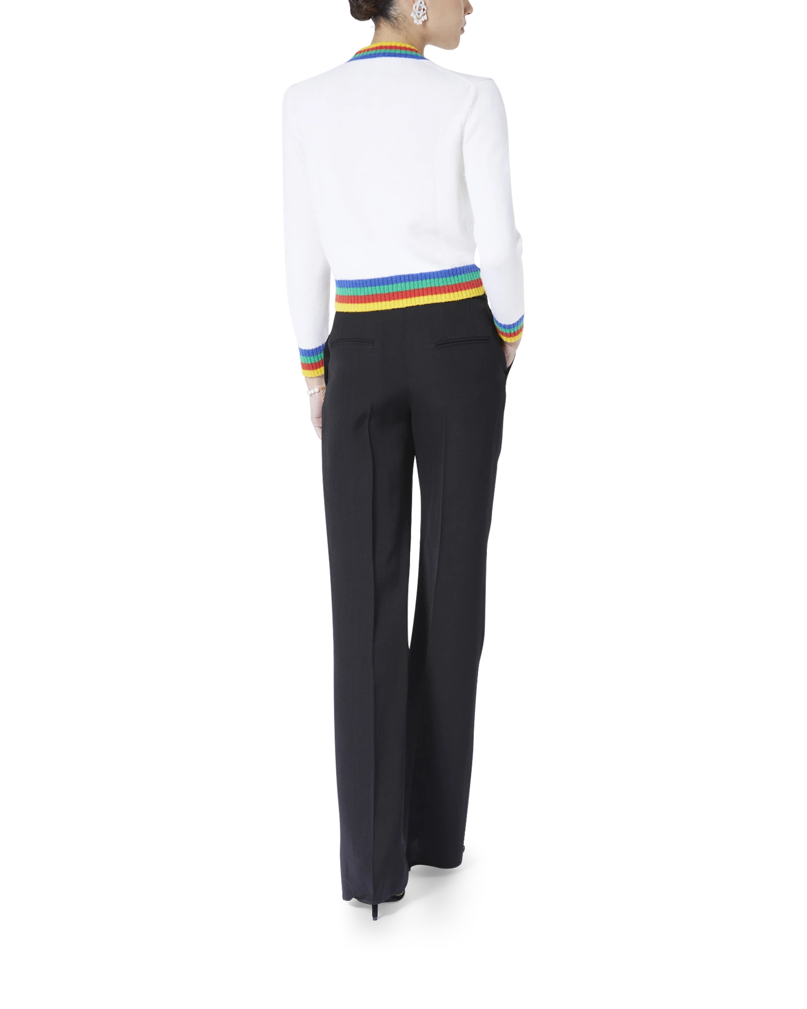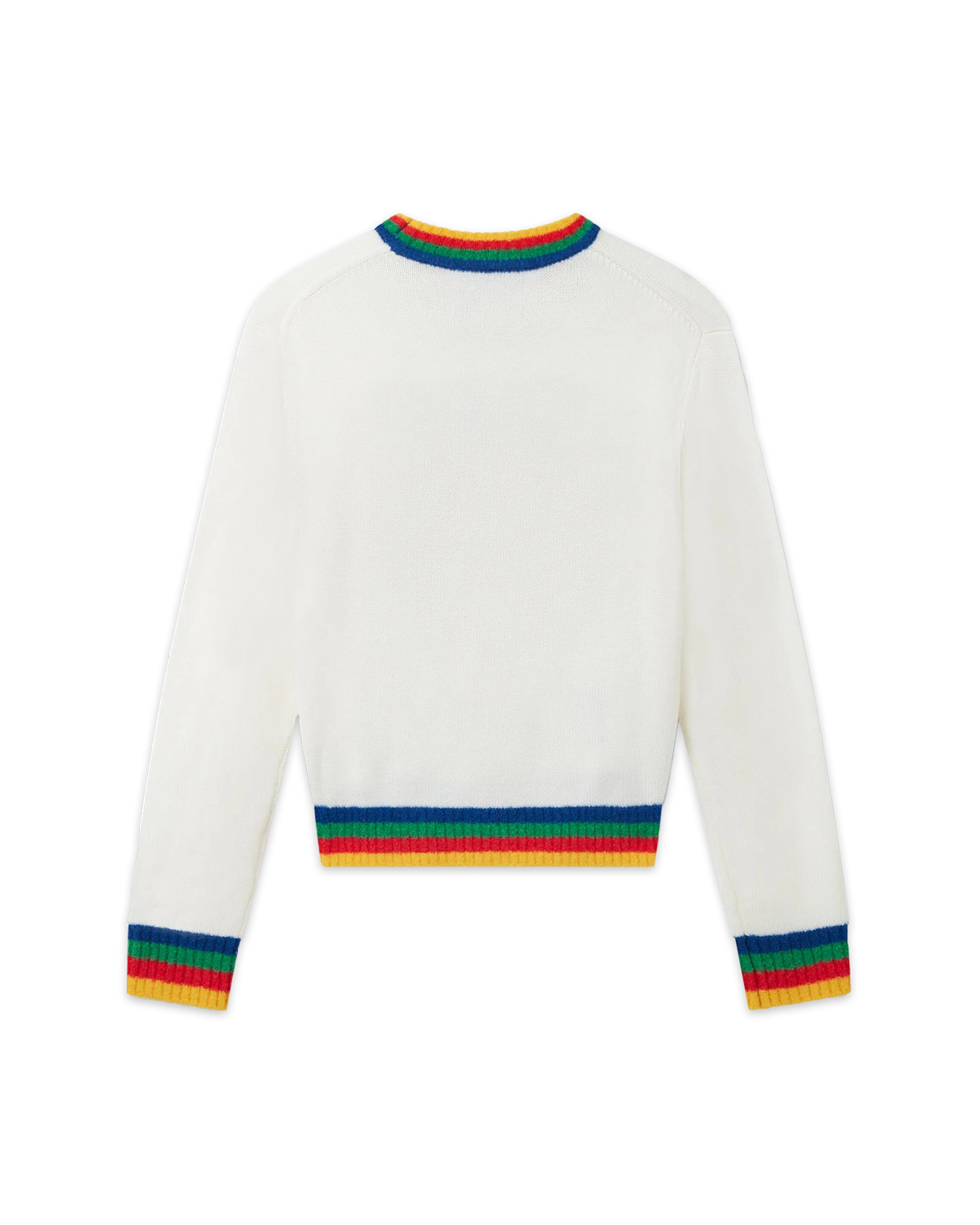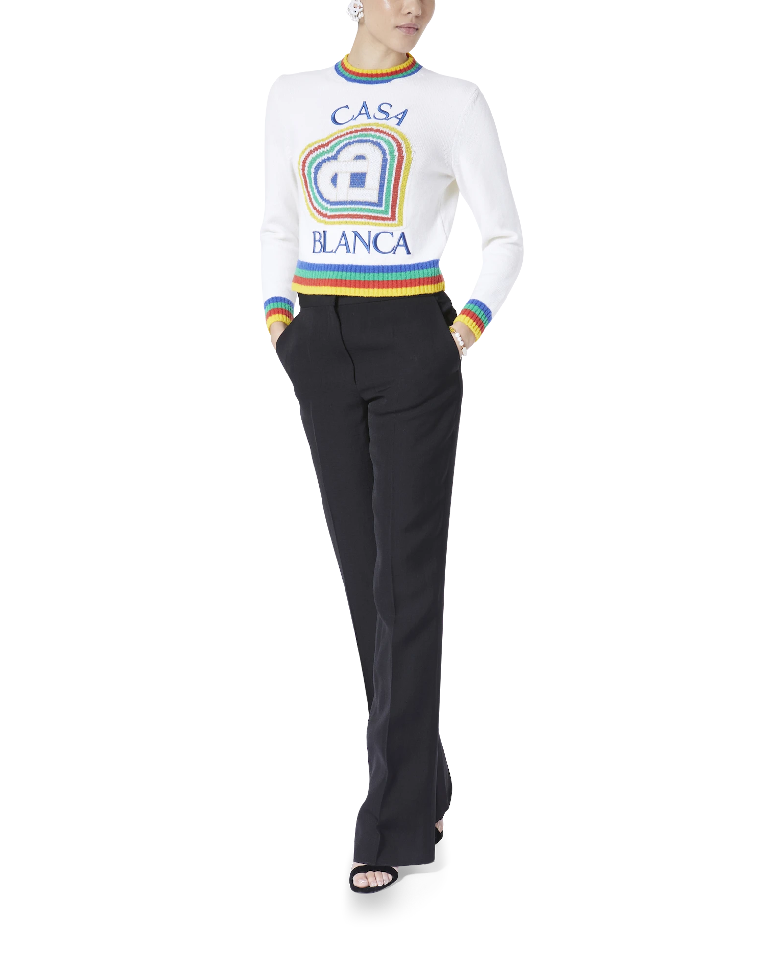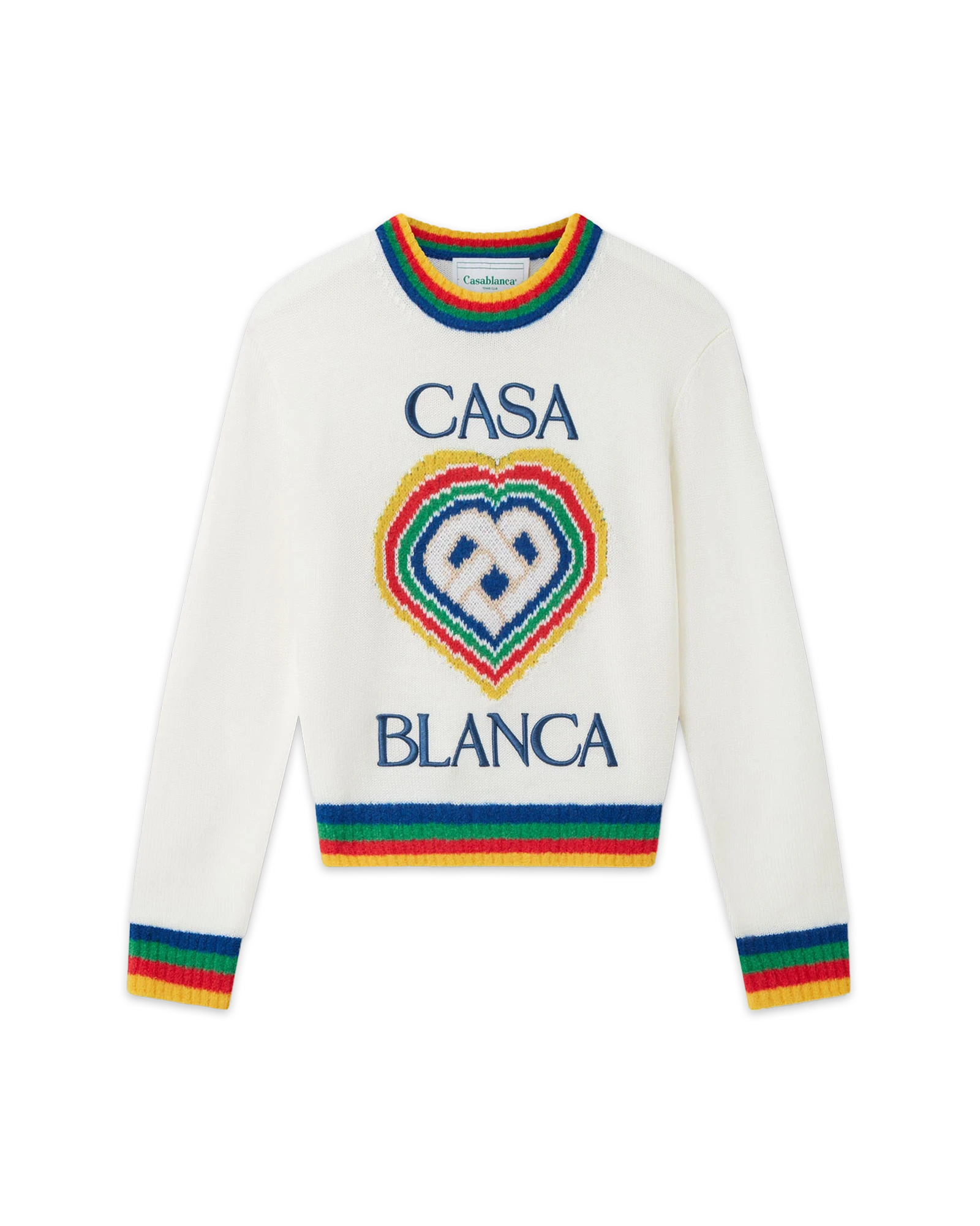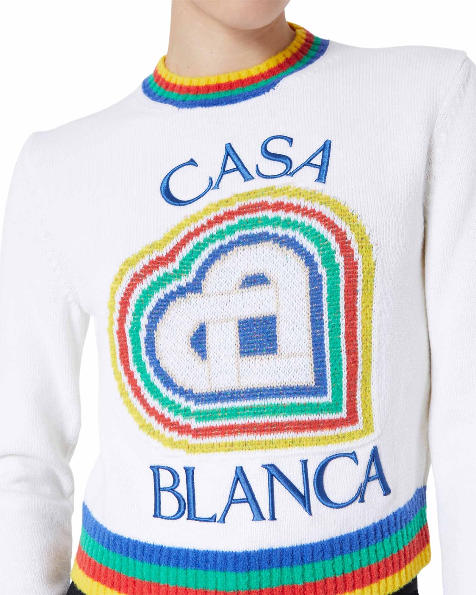 The Heart Casa intarsia wool jumper featuring seasonal artwork incorporating the house’s stacked logo and heart monogram. Completed with a classic long-sleeved crew neck style with contrast rib knit collar and cuffs finishing.
