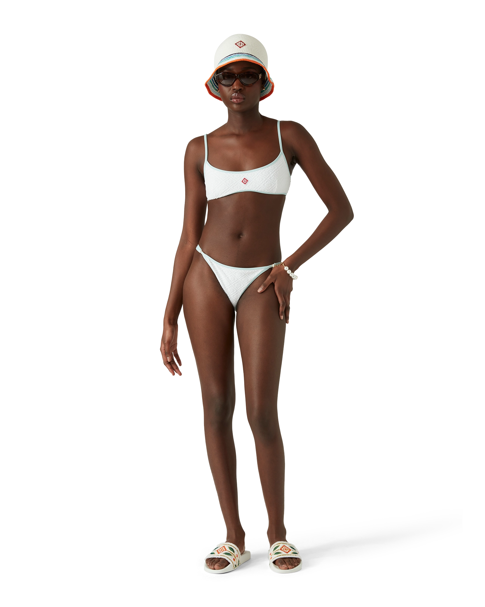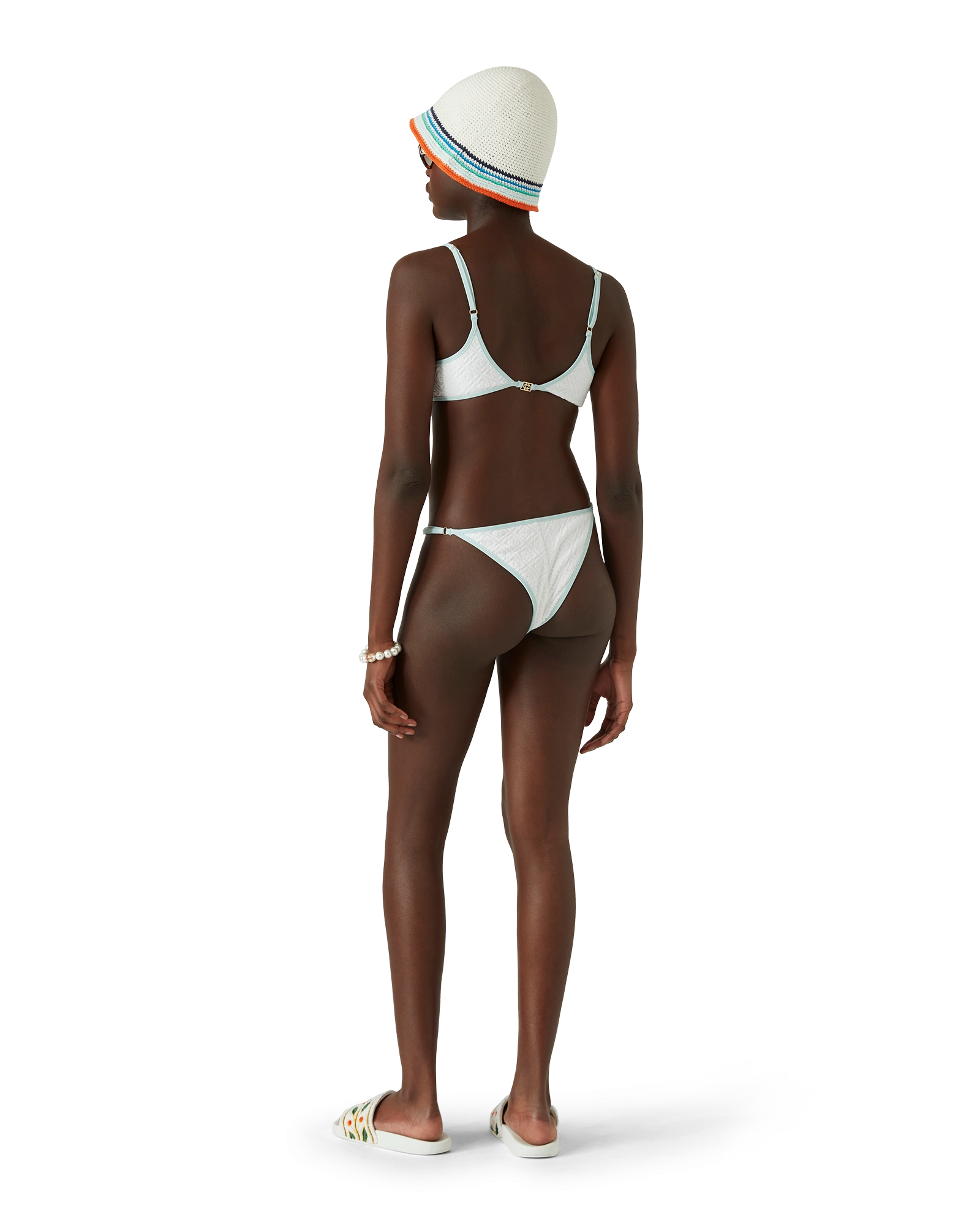 The jacquard monogram bikini bottom is a printed design crafted from a breathable poly-blend fabric. featuring the house’s signature diamond monogram. Completed with light-blue trims – this piece is designed to be worn with its matching bikini top.