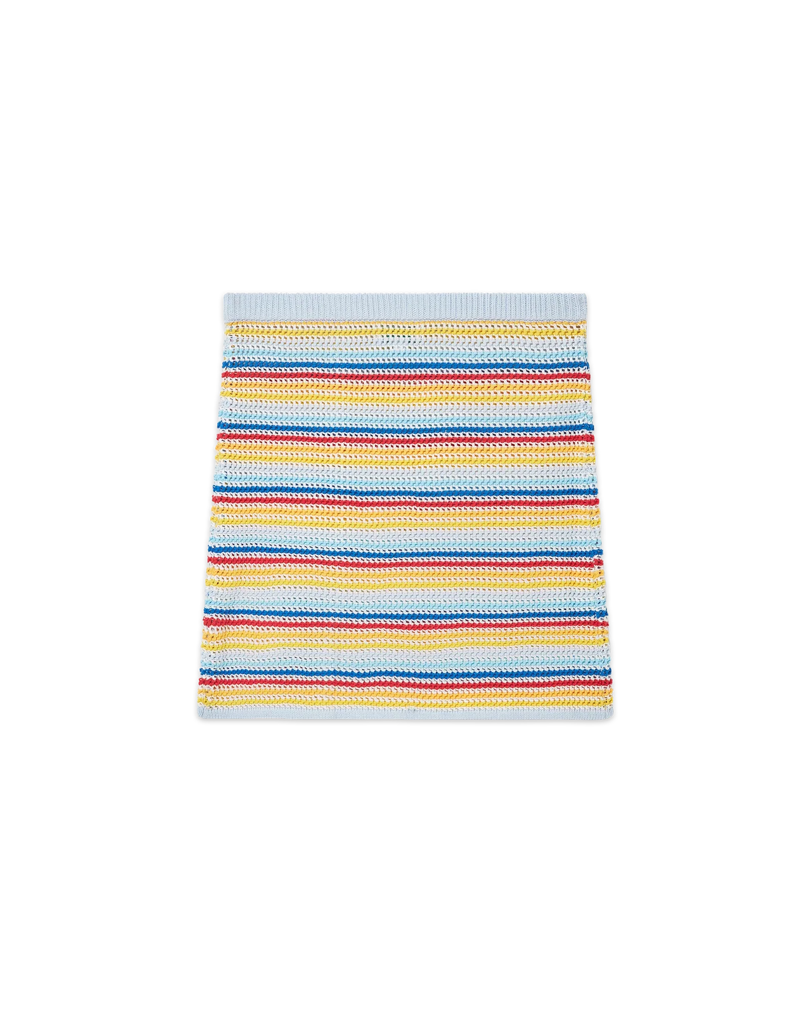 The Knit Stripe Skirt is a knit style featuring seasonal colours finished with a contrast blue rib. Intended to be worn with its coordinating top.