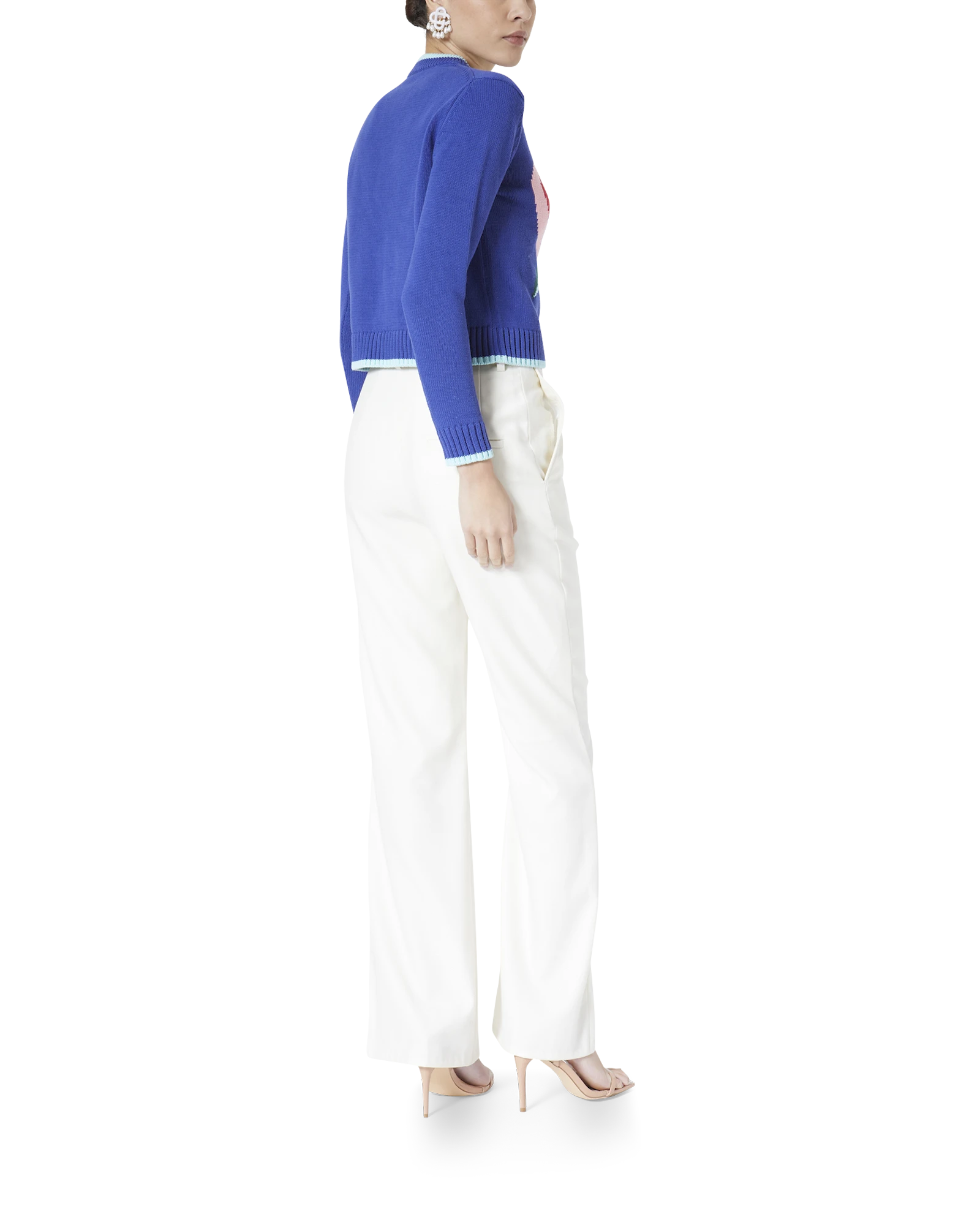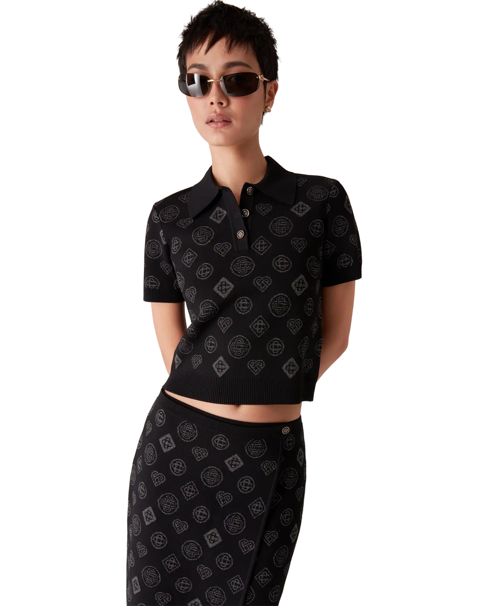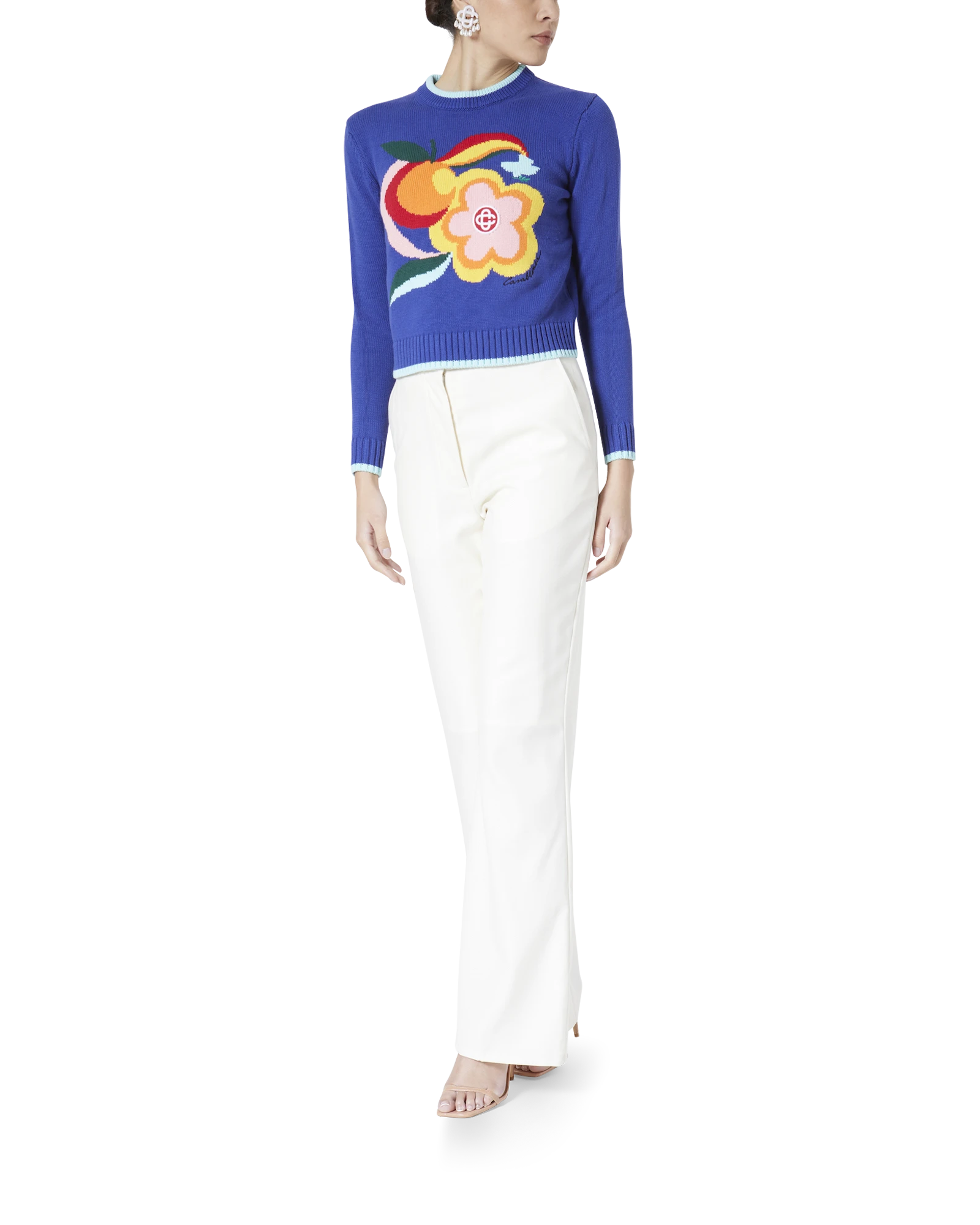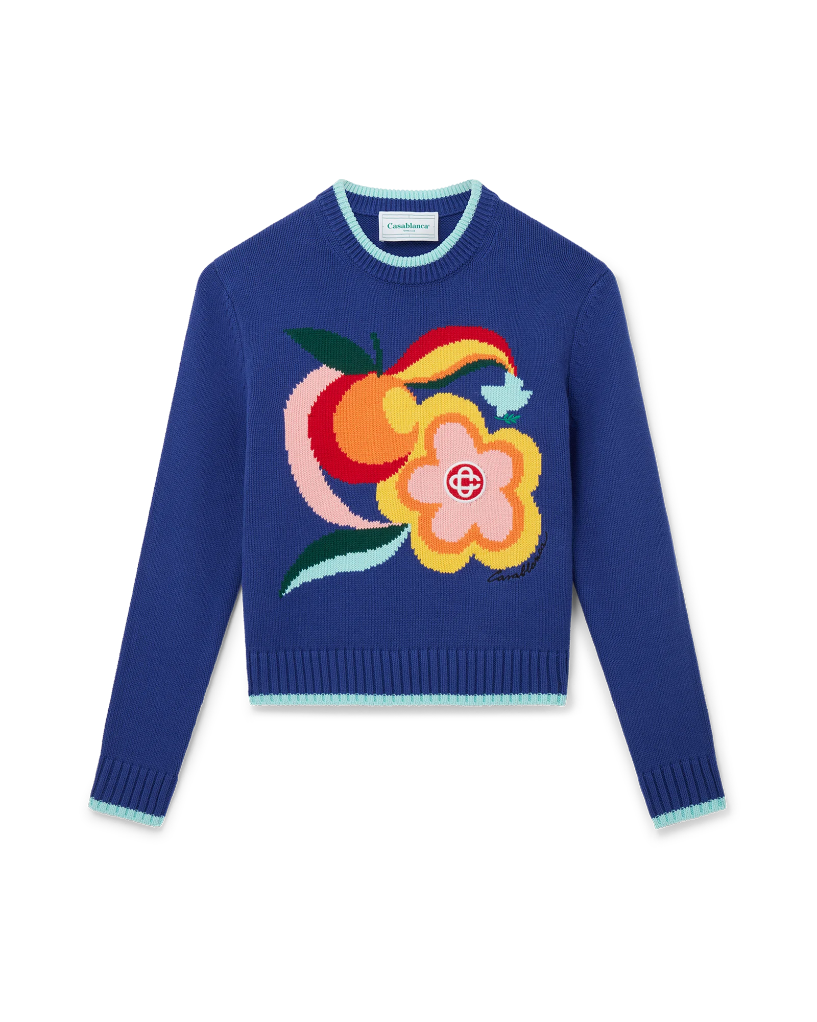 The Le Pouvoir Des Fleurs intarsia cotton jumper featuring seasonal artwork incorporating Casablanca symbology with Arabic iconography. Made of 100% cotton. the style is a classic long-sleeved high neck style with contrast rib knit collar and cuffs and has been designed for a classic fit.