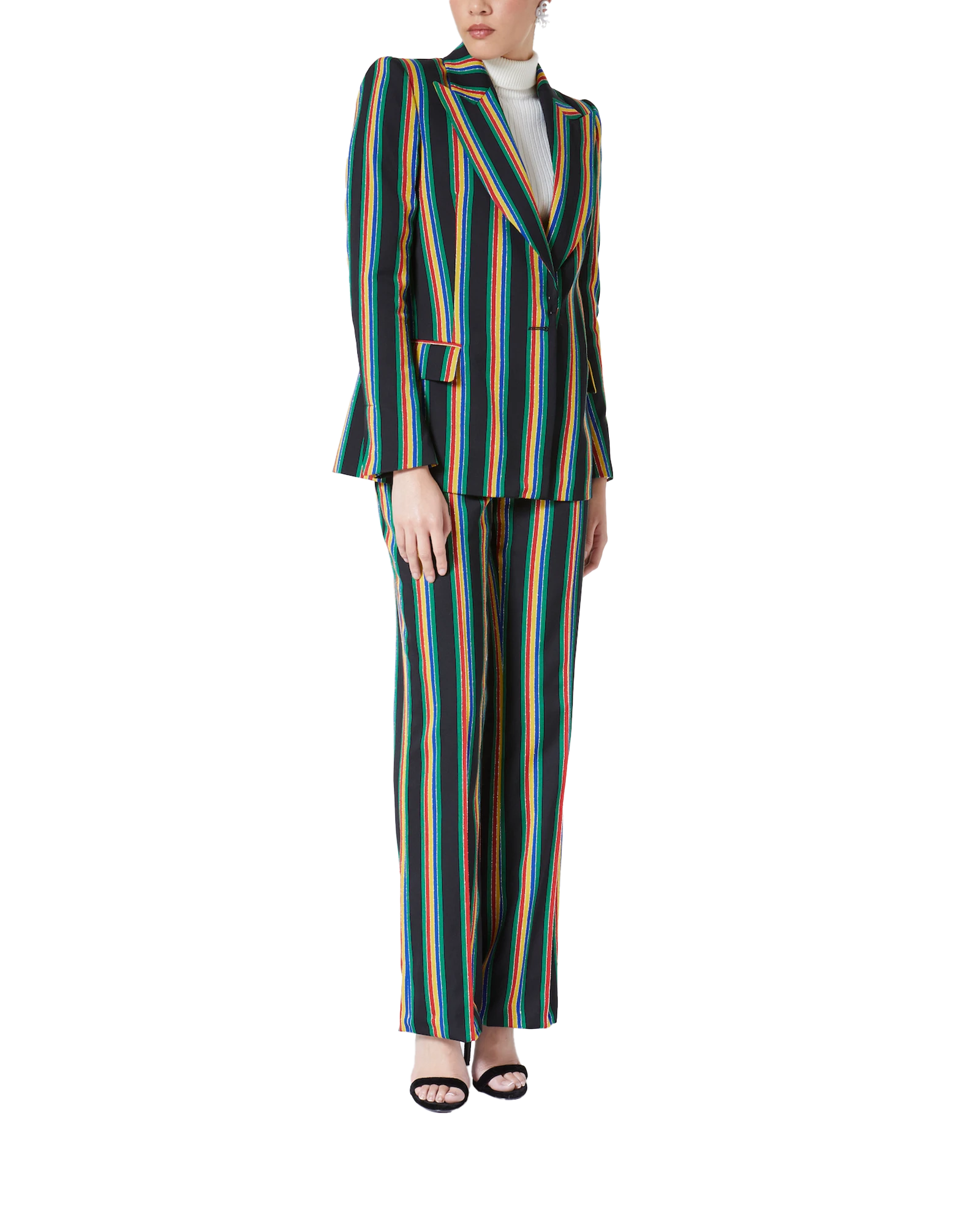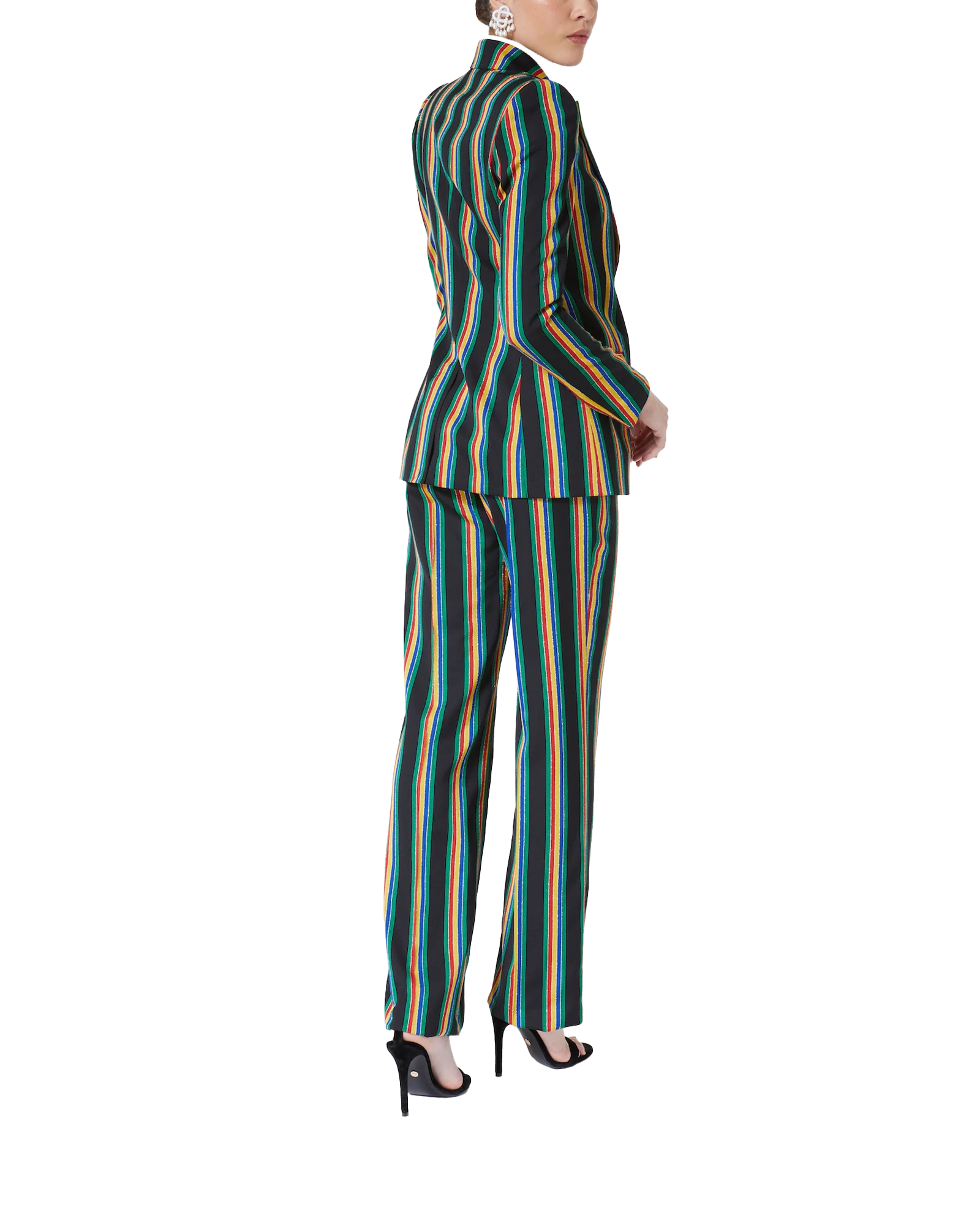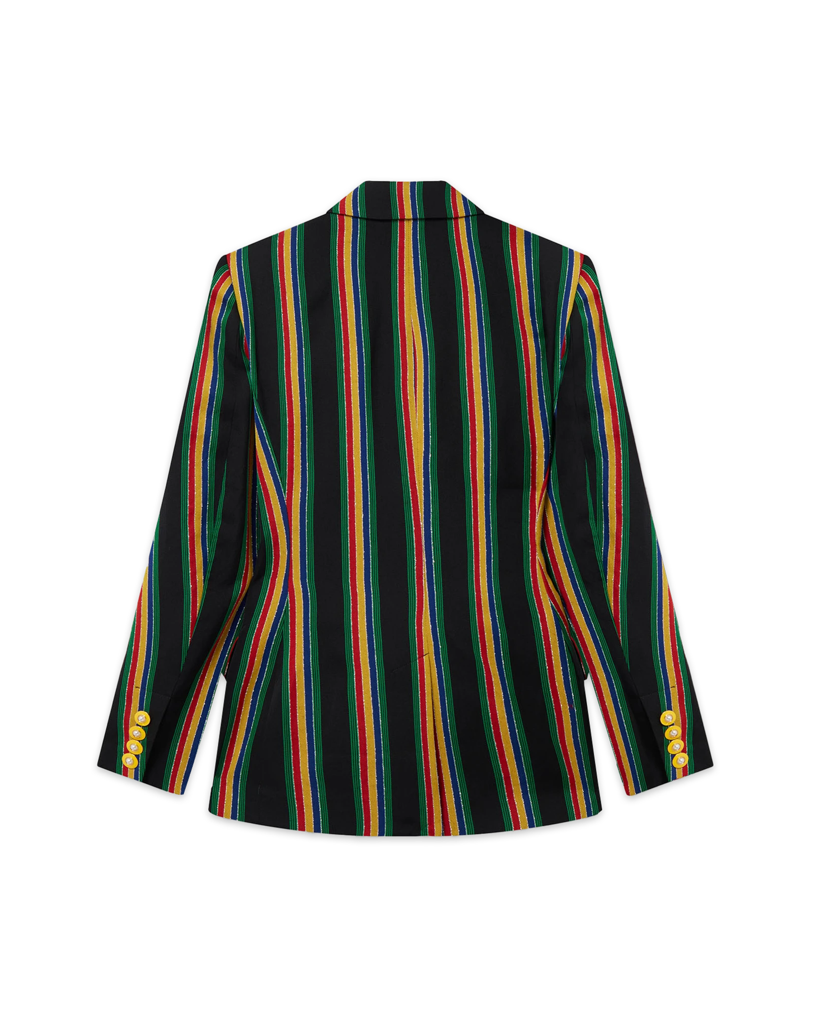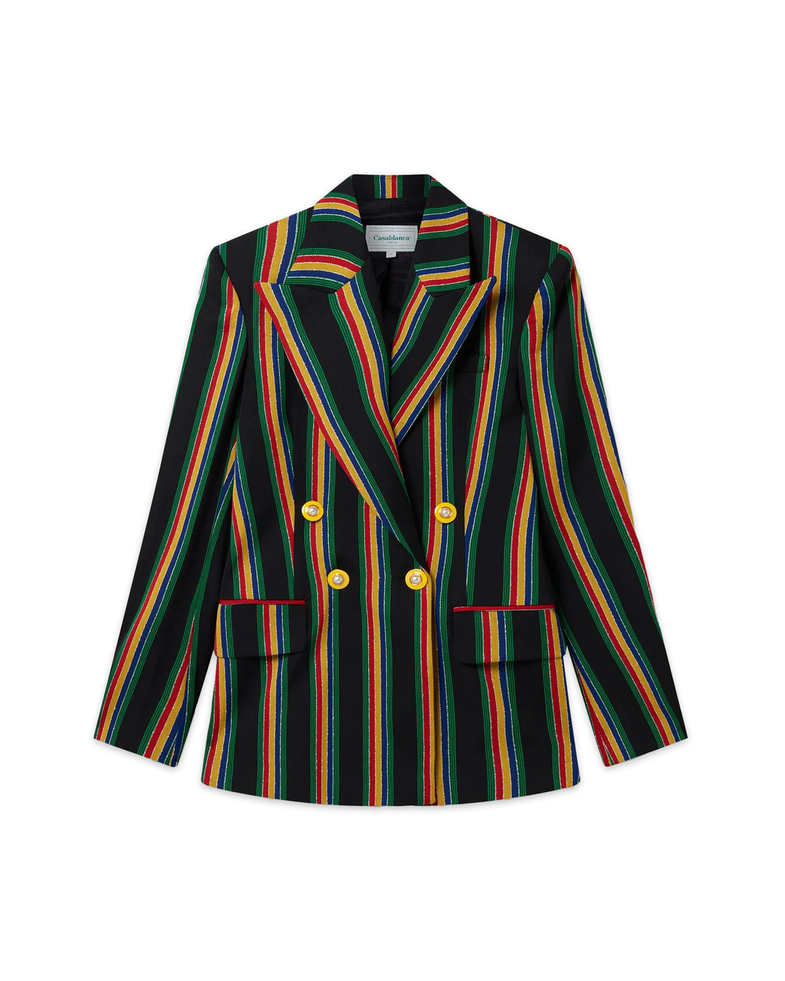 The Medallion Suit Breasted Jacket is a classic double-breasted tailored jacket featuring an all-over lurex stripe design. Completed with a front lapel. double button and cuff fastening. Intended to be worn with its coordinating trousers.