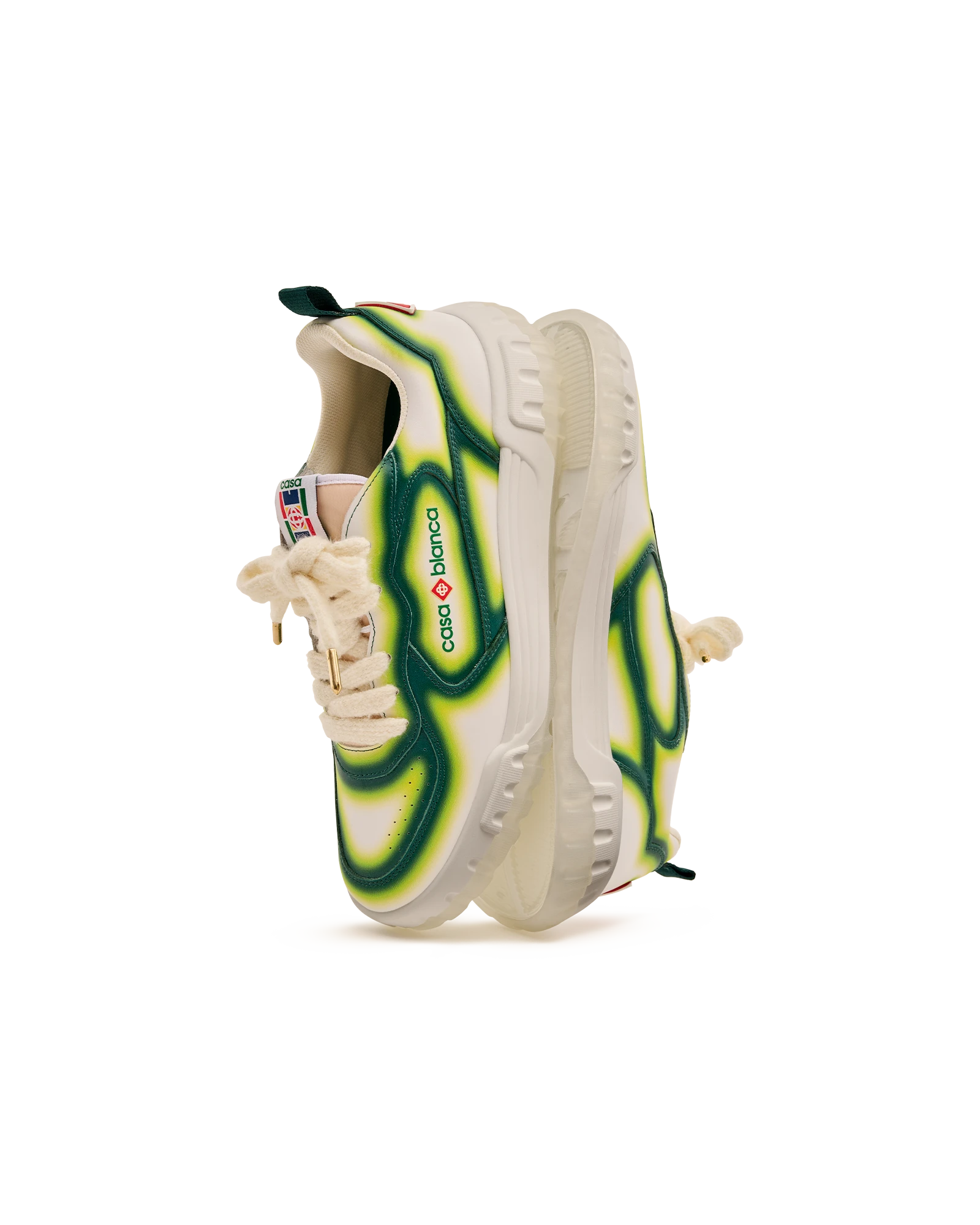 The design language of the Court Sneaker reflects the iconic silhouettes of the 90s. The colours featured throughout the rubber sole are a combination of the refined codes of tennis and classic architecture and create a unified palette throughout the shoe. with the focus on primary colours offset by tennis whites to create a sports focus colour story. The upper of the shoe features integrated. flowing panel lines as a nod to the iconic silhouettes of the 90s. Prominent Casablanca branding throughout is evident. including the brand???s signature diamond motif on the heel. silicone wordmark lateral panelling and the woven tennis court motif tongue label and insole. giving rise to its name. The Court.