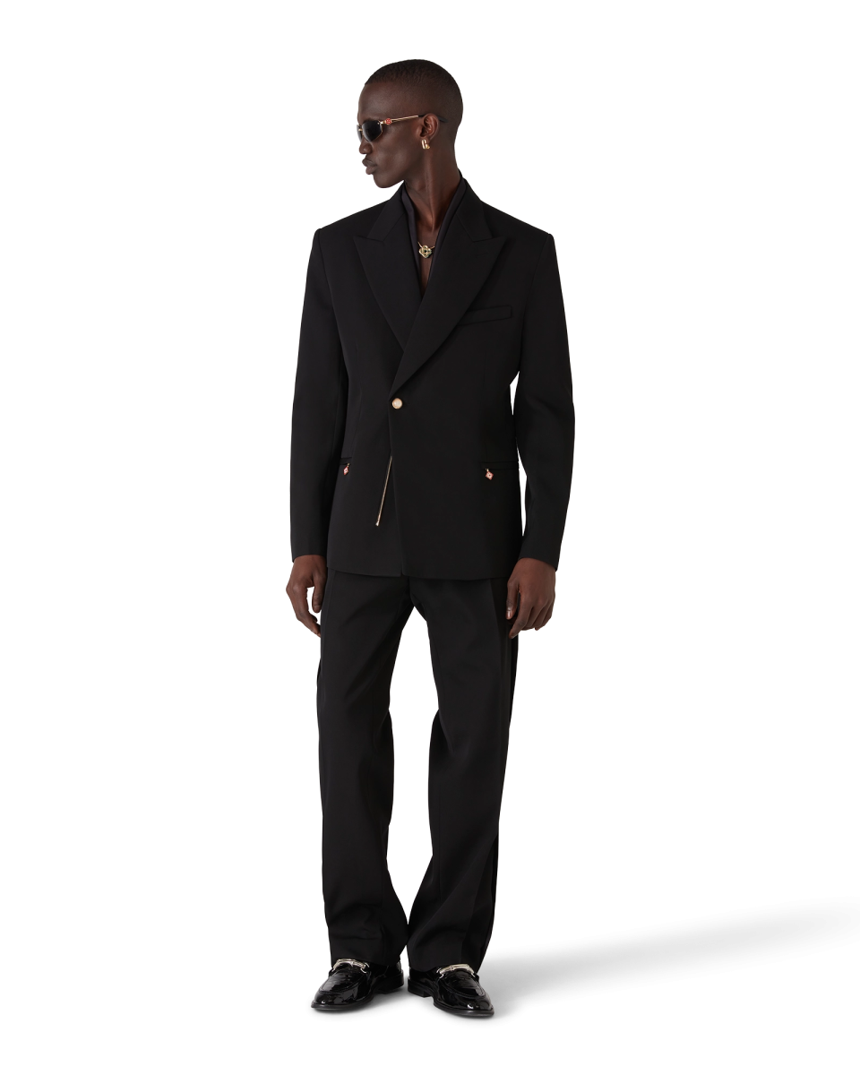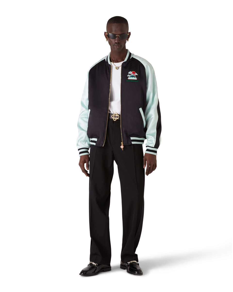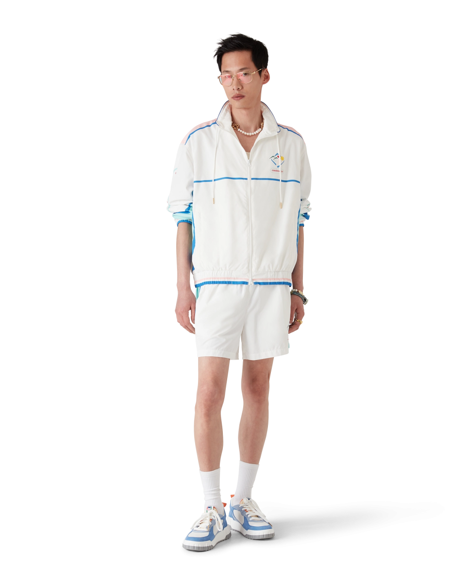 The monogram gradient towelling jacket is a soft textured printed design with a classic silhouette crafted from a gradient towelling fabric featuring the house’s signature diamond monogram. Completed with a zip closure. gold-plated hardware. and a peak collar.