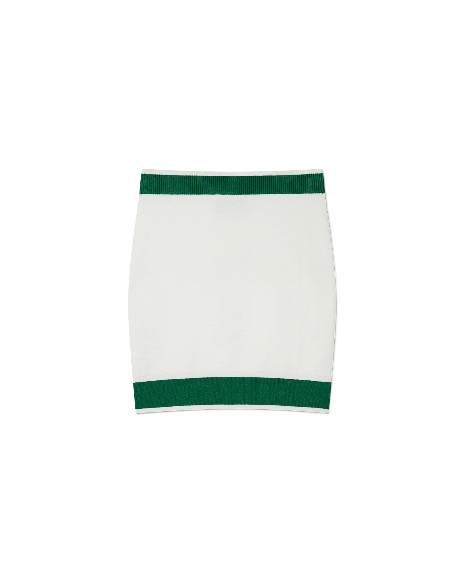 The monogram skirt is a white mini-skirt design featuring a green contrast hem and waistband with white detailing. Crafted from a viscose blend. complete with an elasticated waist and Casablanca branded label.