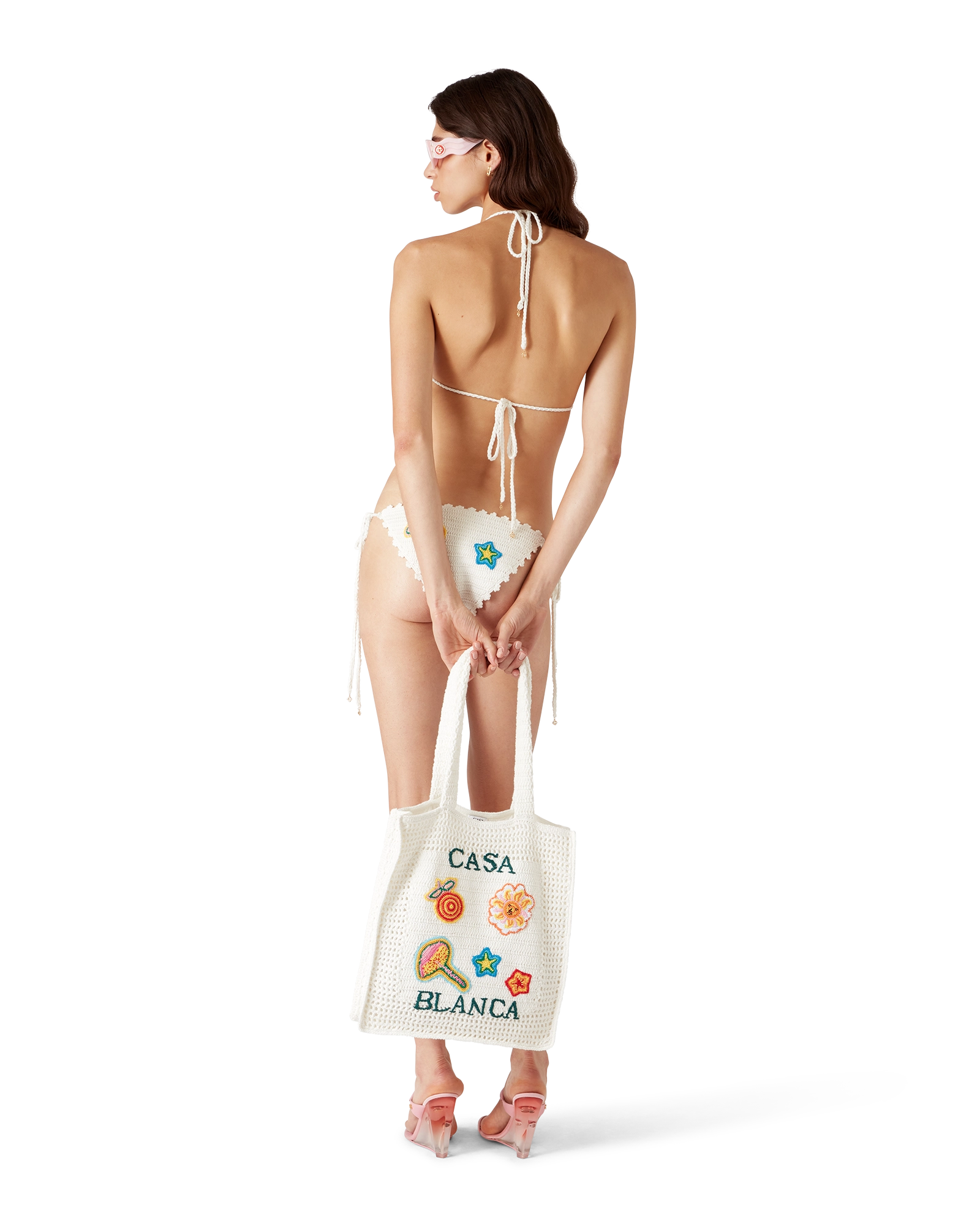 The motif crochet bikini top is a triangular design crafted from crochet fabric. Completed with motifs of the house’s classic design elements. and string fastenings at the neck and back. This piece is completed with removable padding and is intended to be worn with its coordinating bikini bottom.