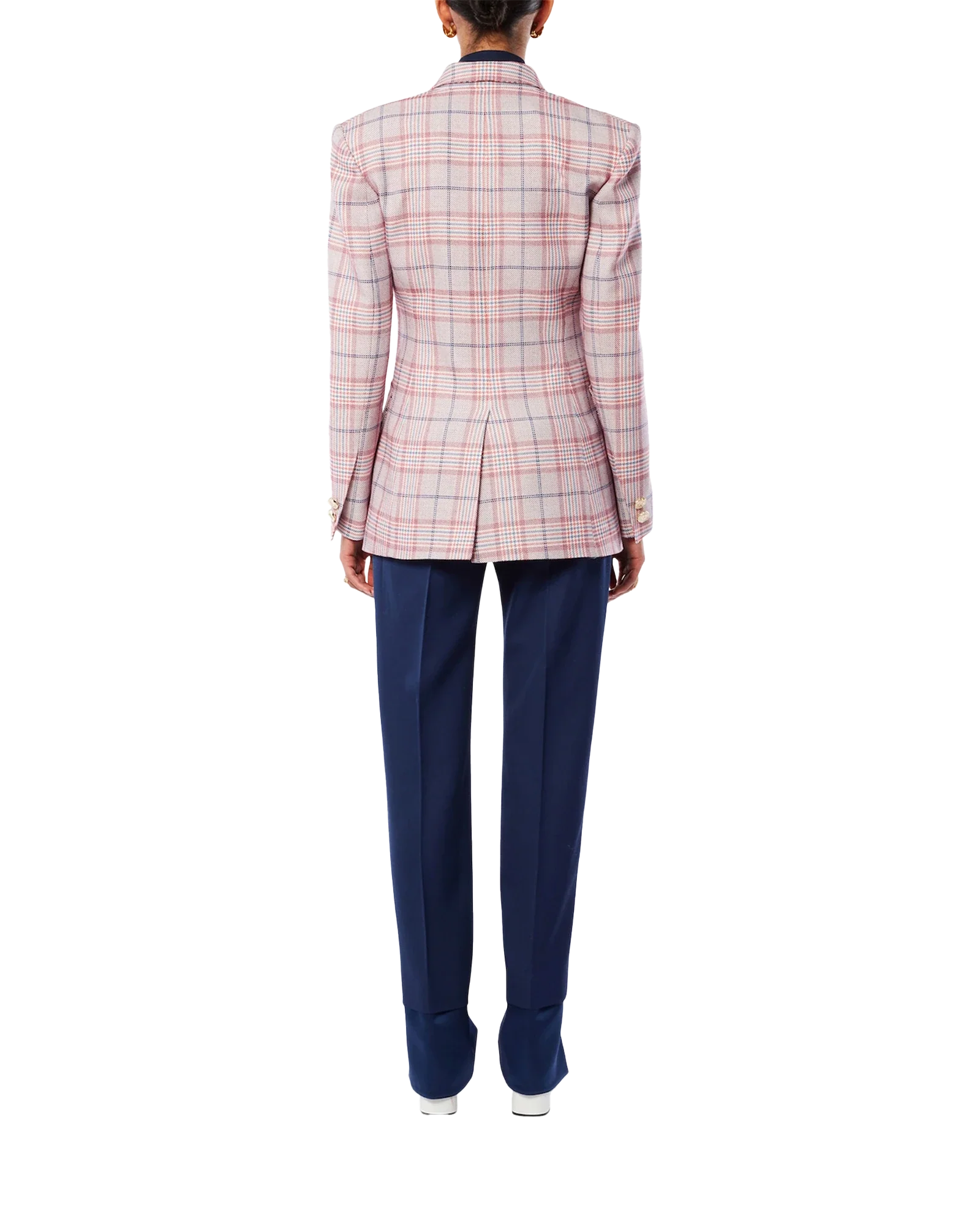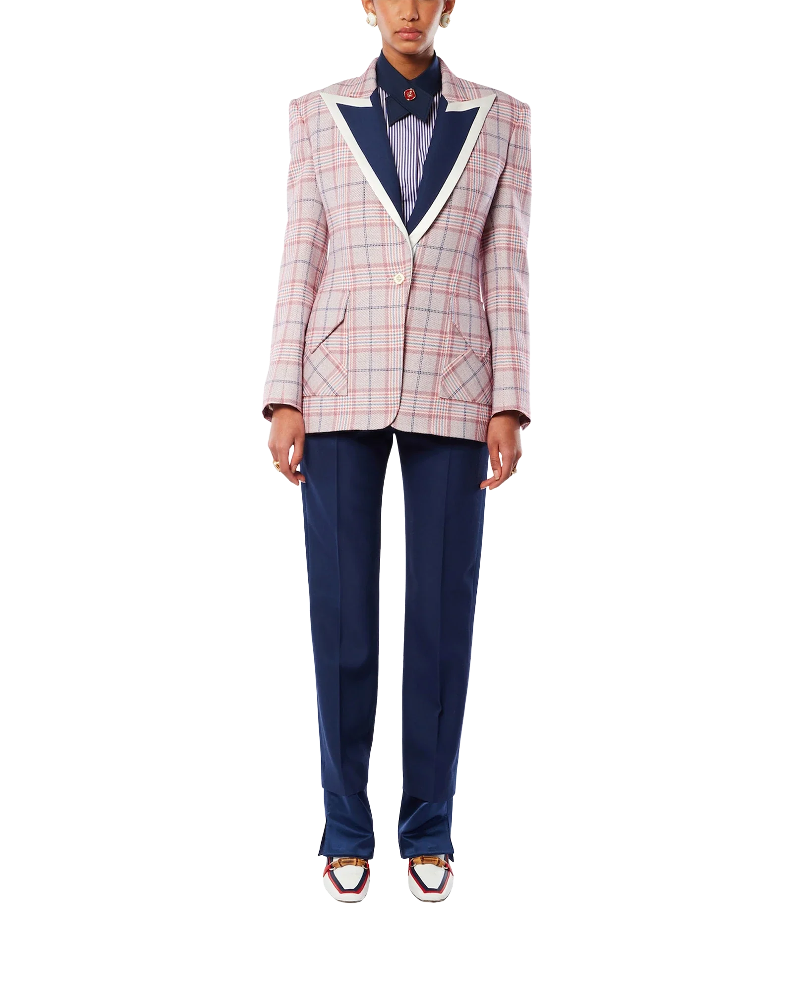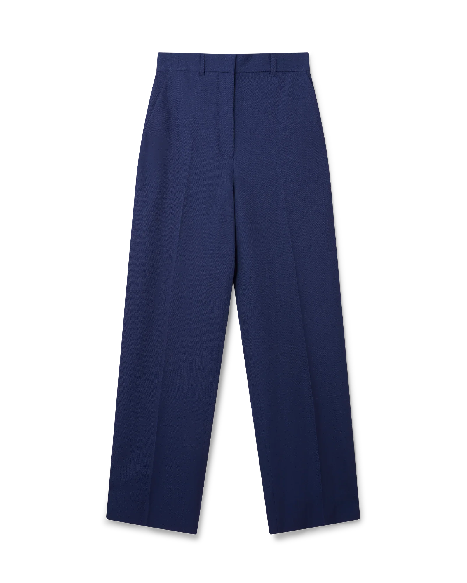 The navy wide-leg trouser is a classic tailored design. crafted from 100% virgin wool. Completed with slanted pockets. a back pocket. belt loops. cotton blend lining and a Casablanca Paris label.
