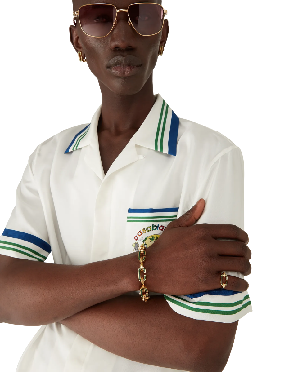 The Nigerian pebble stone monogram necklace is a multicoloured design crafted from pre-dyed pebble stones. Completed with the Casablanca monogram. a gold-plated chain and lobster clasp fastening.