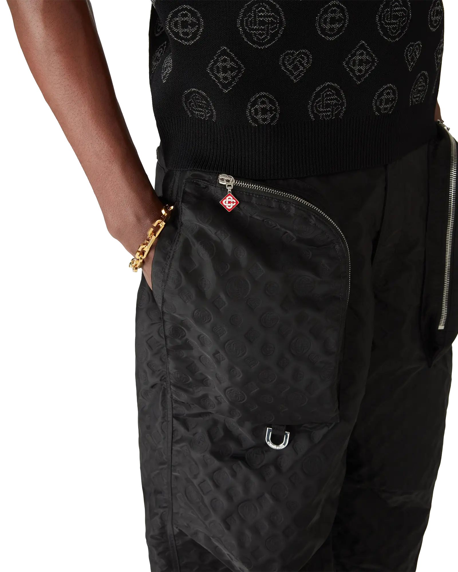The nylon jacquard cargo trousers are a straight-leg design featuring the house’s Honeydew logo repeat. This repeat differs from our other monograms. as it combines unique shapes to form a cohesive pattern. Completed with belt loops. zip closure. patch pockets with zip closure featuring the house’s signature diamond logo zipper tabs. silver-plated hardware. and drawstring fastening at the ankles featuring interlocking CC toggle.