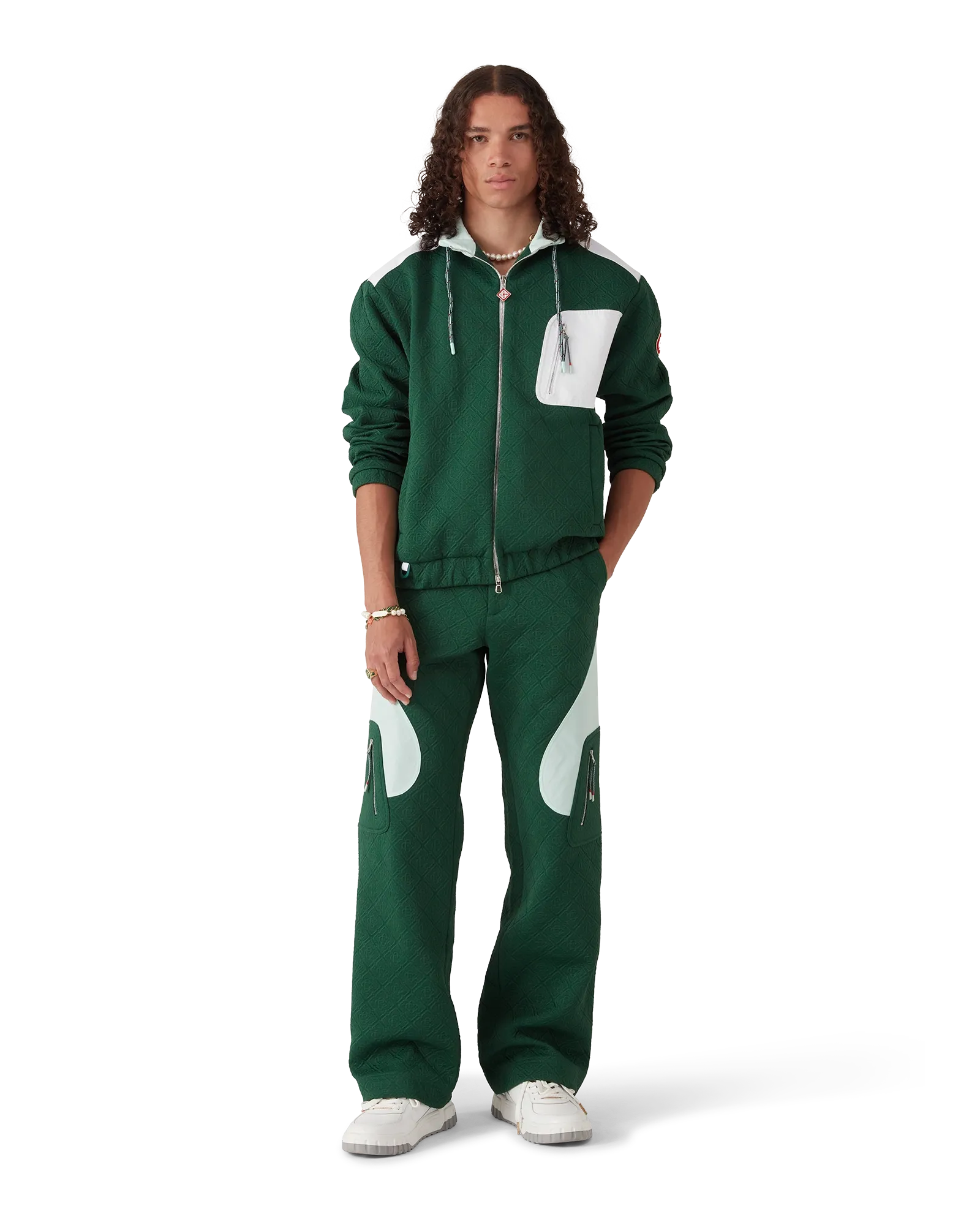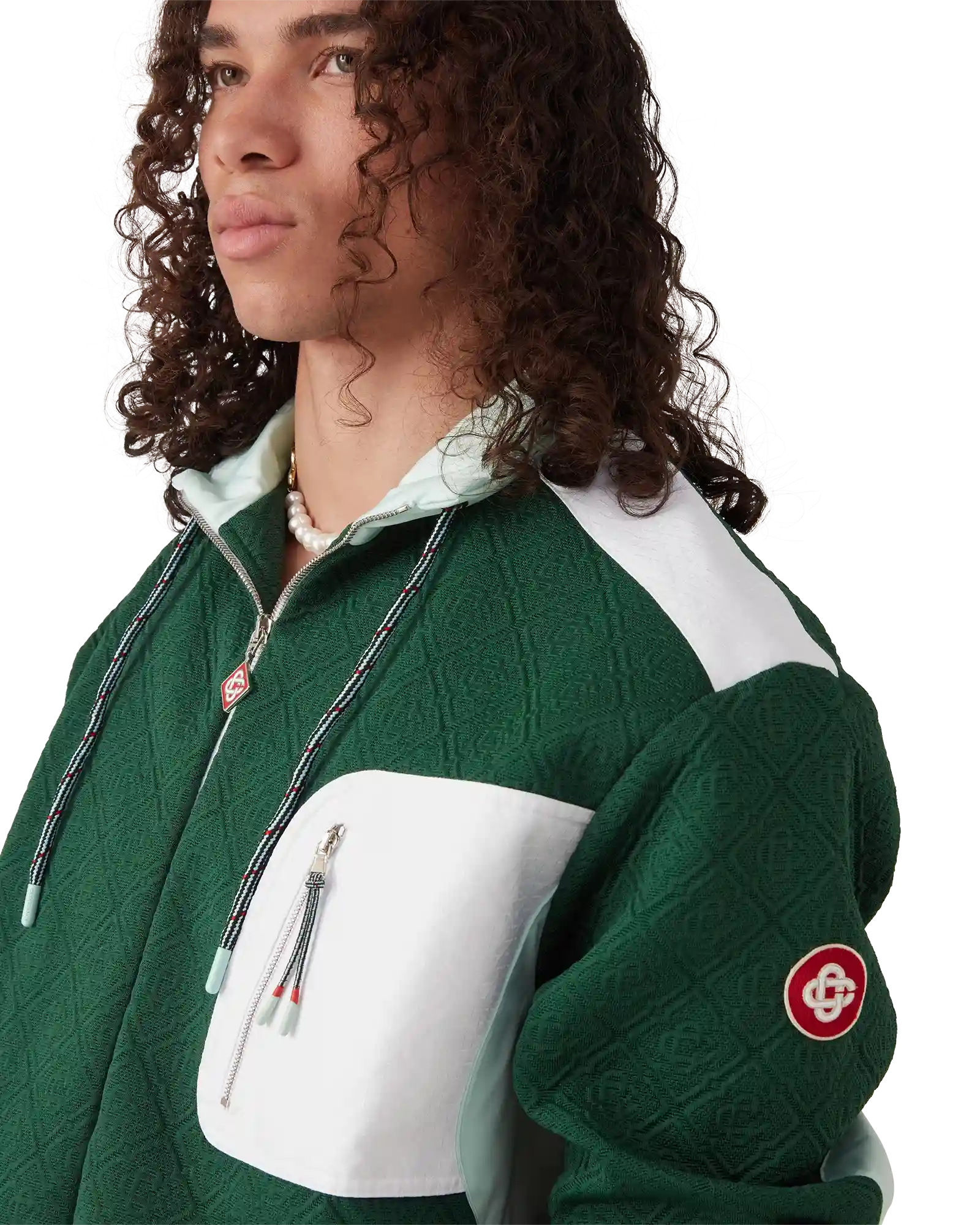 The nylon monogram jacquard jacket is a long-sleeve design crafted from jacquard knit fabric. Completed with a high collar featuring drawstring fastening. zip closure. vertical welt pockets and a contrast breast pocket with zip closure. elasticised cuffs and hem. elbow patches. the house’s CC logo patch on the sleeve. underarm panel with ventilation hole. and mesh lining.