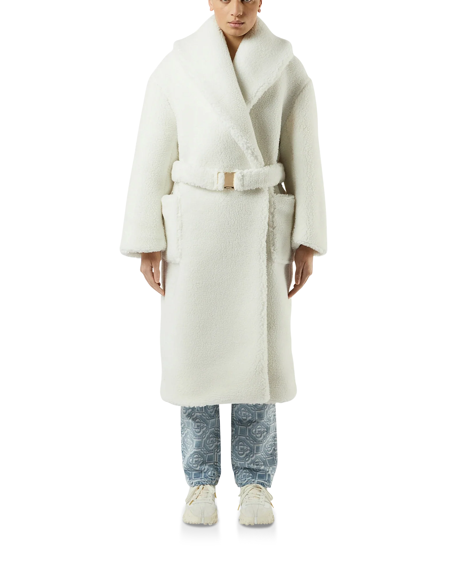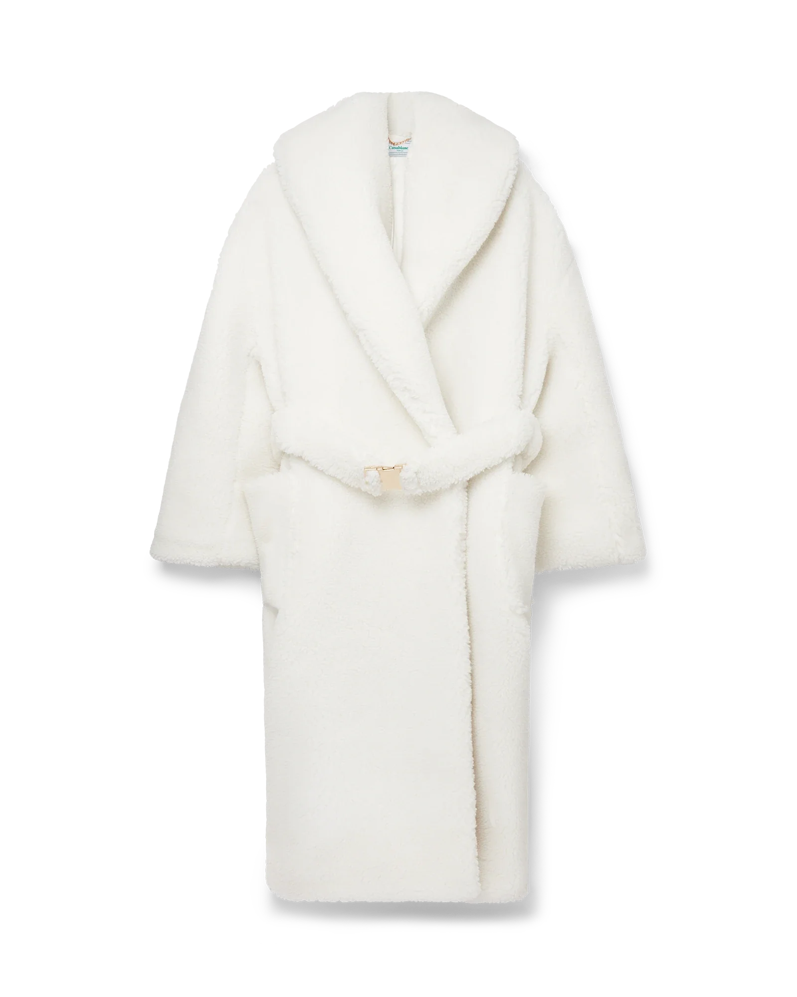 The off-white faux shearling robe coat is a long-sleeve design with shawl collar. Crafted from the house’s signature faux shearling with lining. this piece features large side pockets. and a belt with gold-plated metal buckle.