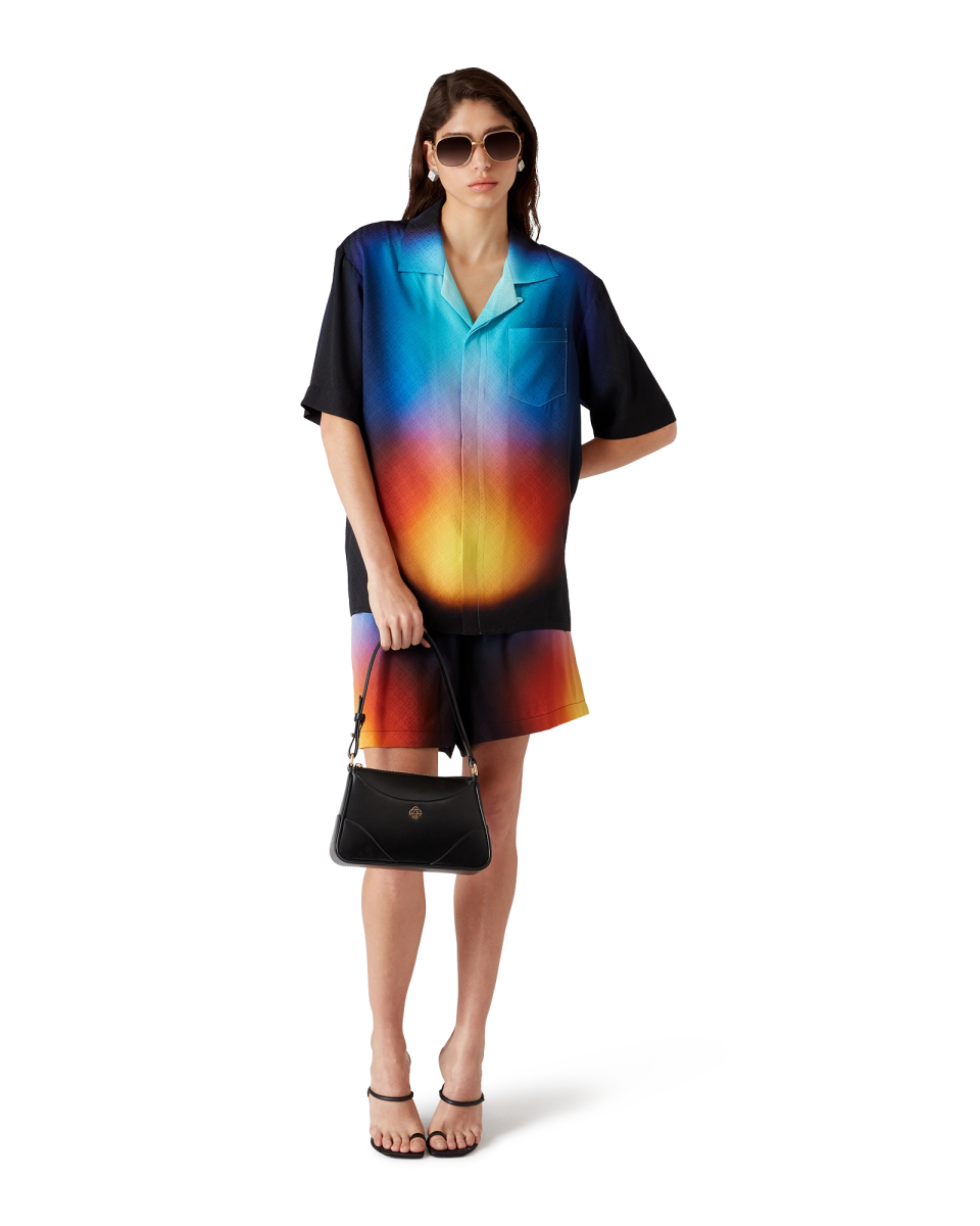 The Oranges En Fleur silk shirt is a long-sleeve design featuring the house’s classic iconography and seasonal artwork on the back and the breast pocket. Finished with green-bordered Laurel artwork detailing on the collar. cuffs. hem and button closure. enamel rim pearl buttons and a Casablanca branded label.