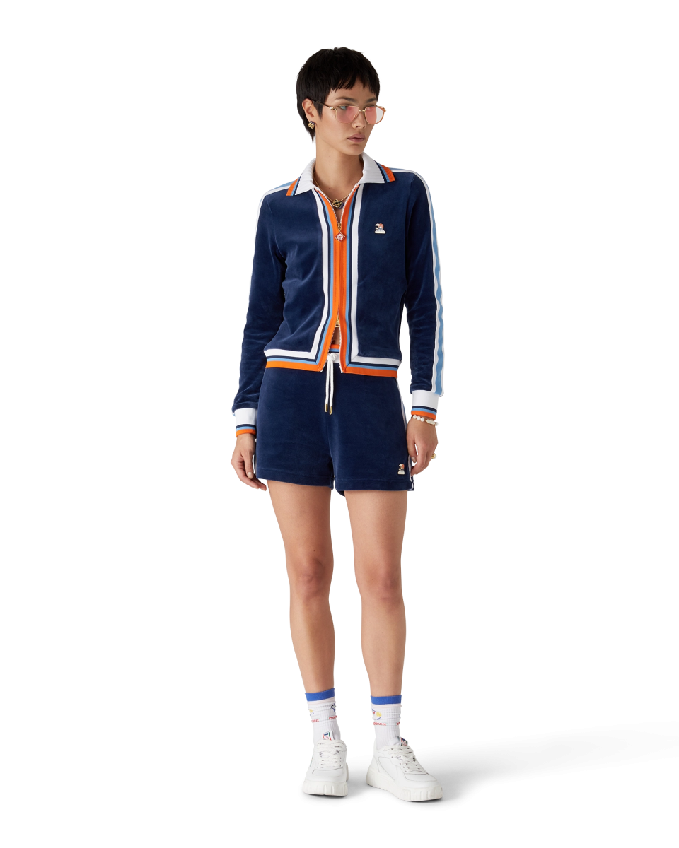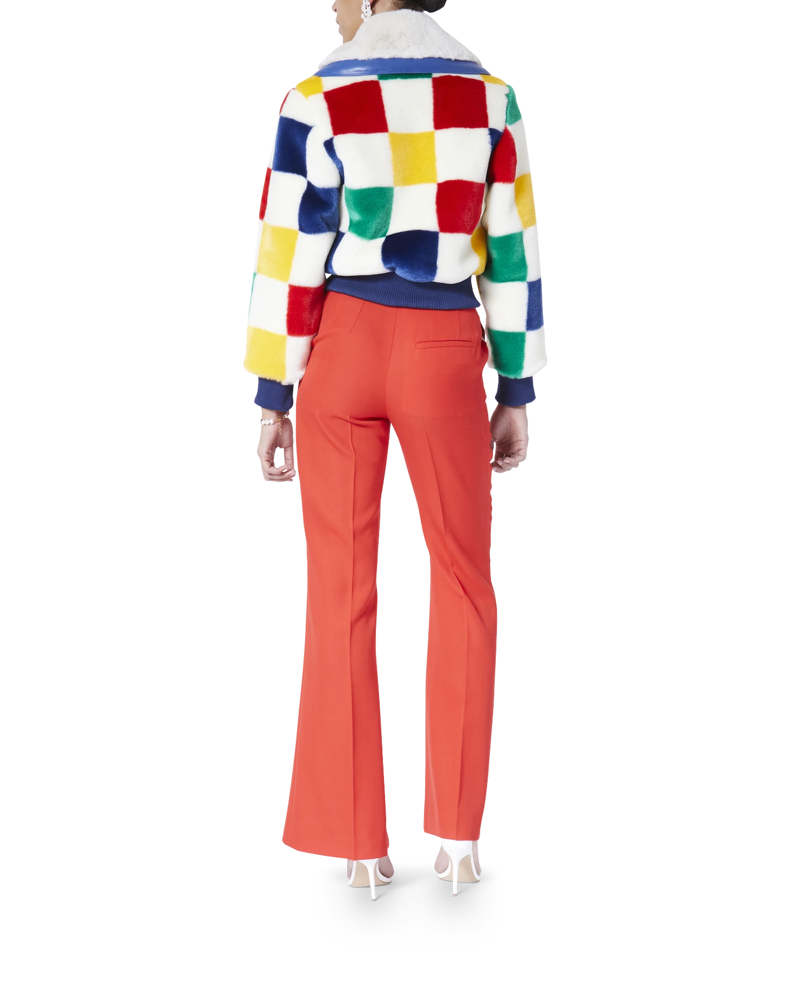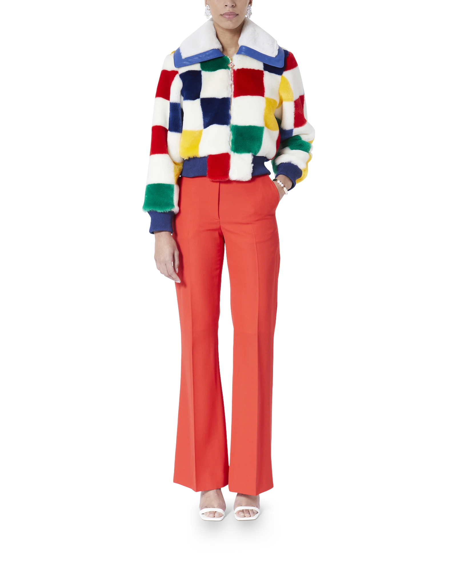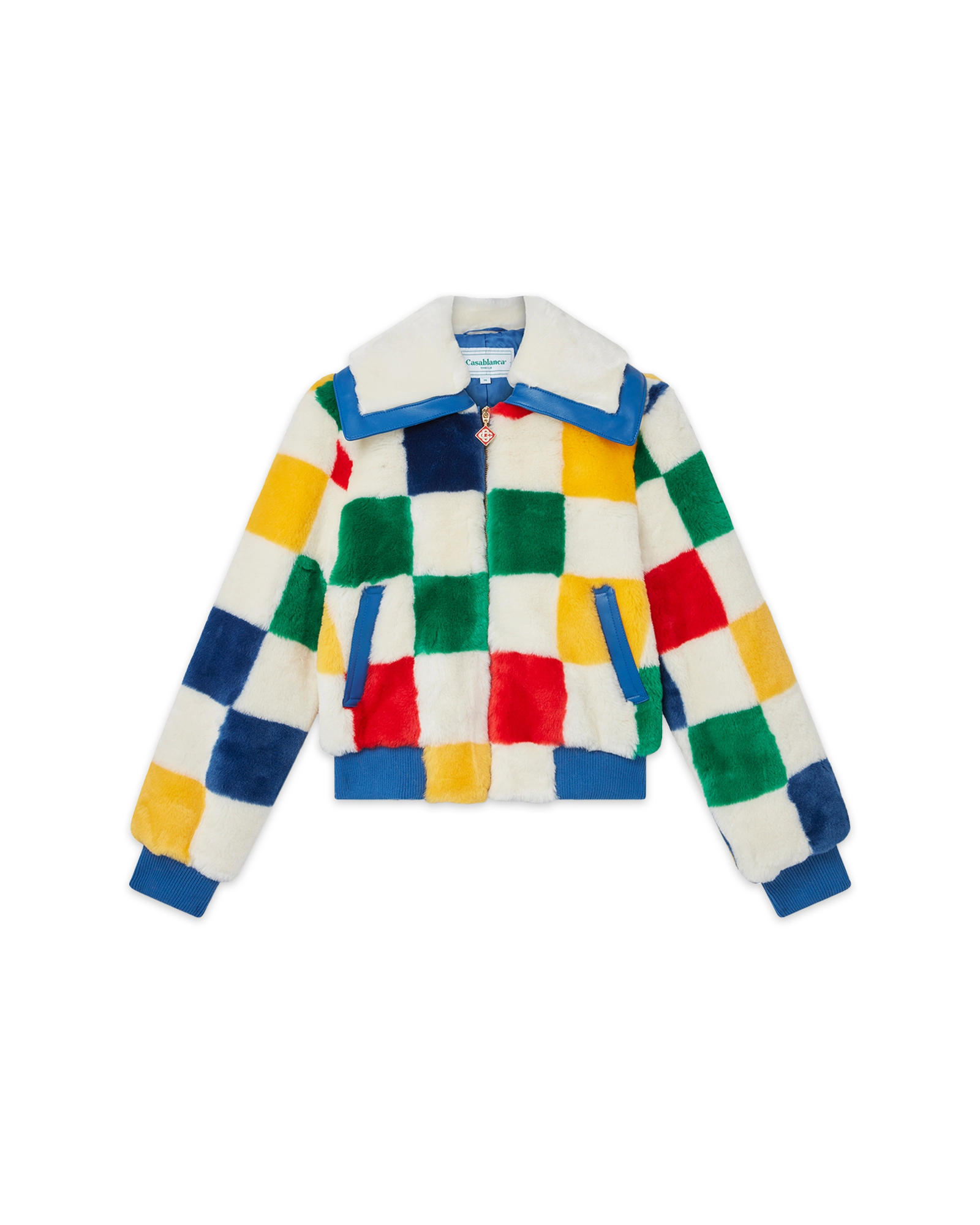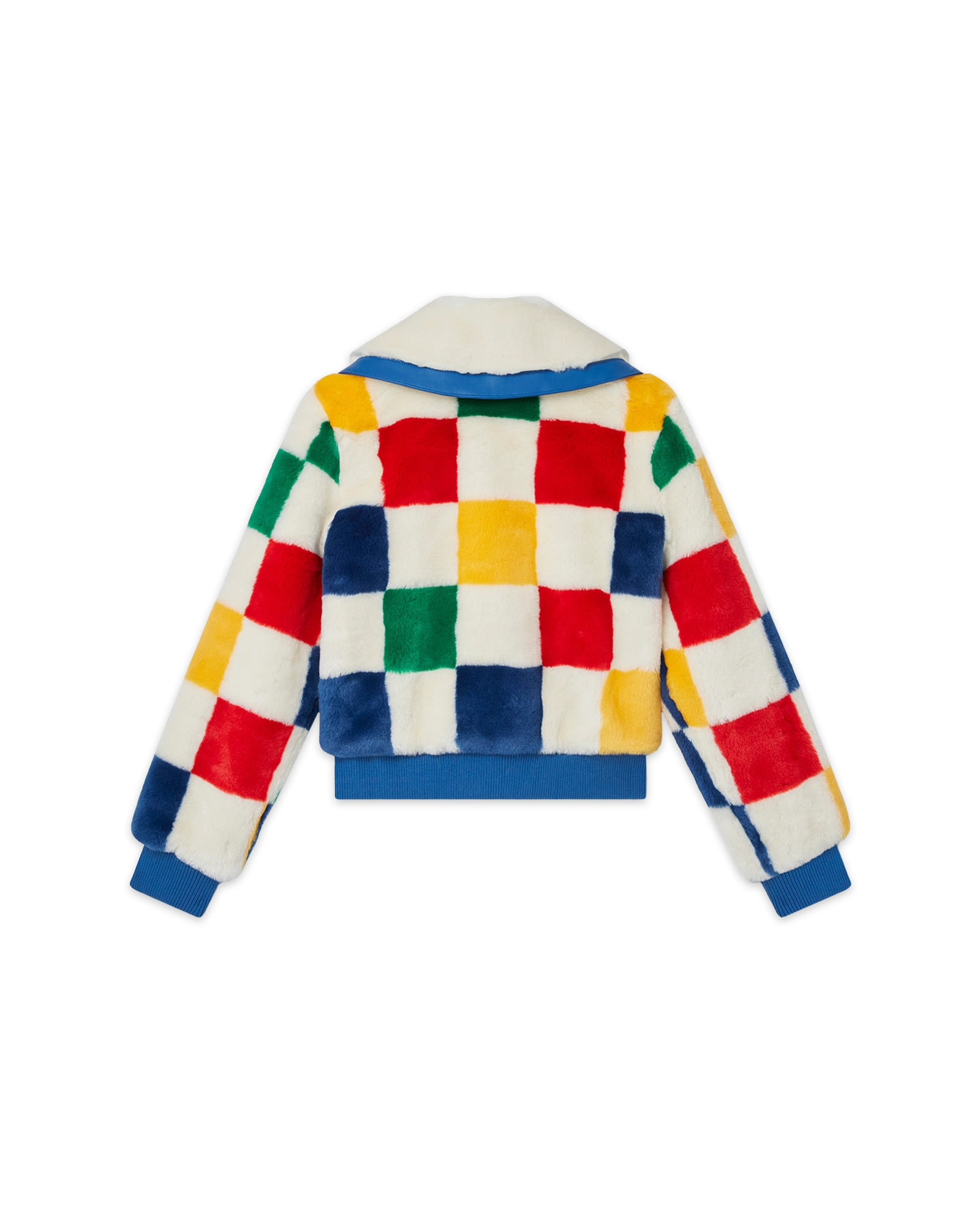 The Primary Check faux fur jacket is a long-sleeve short style featuring a seasonal colour block design. Completed with a contrast collar and blue hem finish. front zip closing and two side pockets.