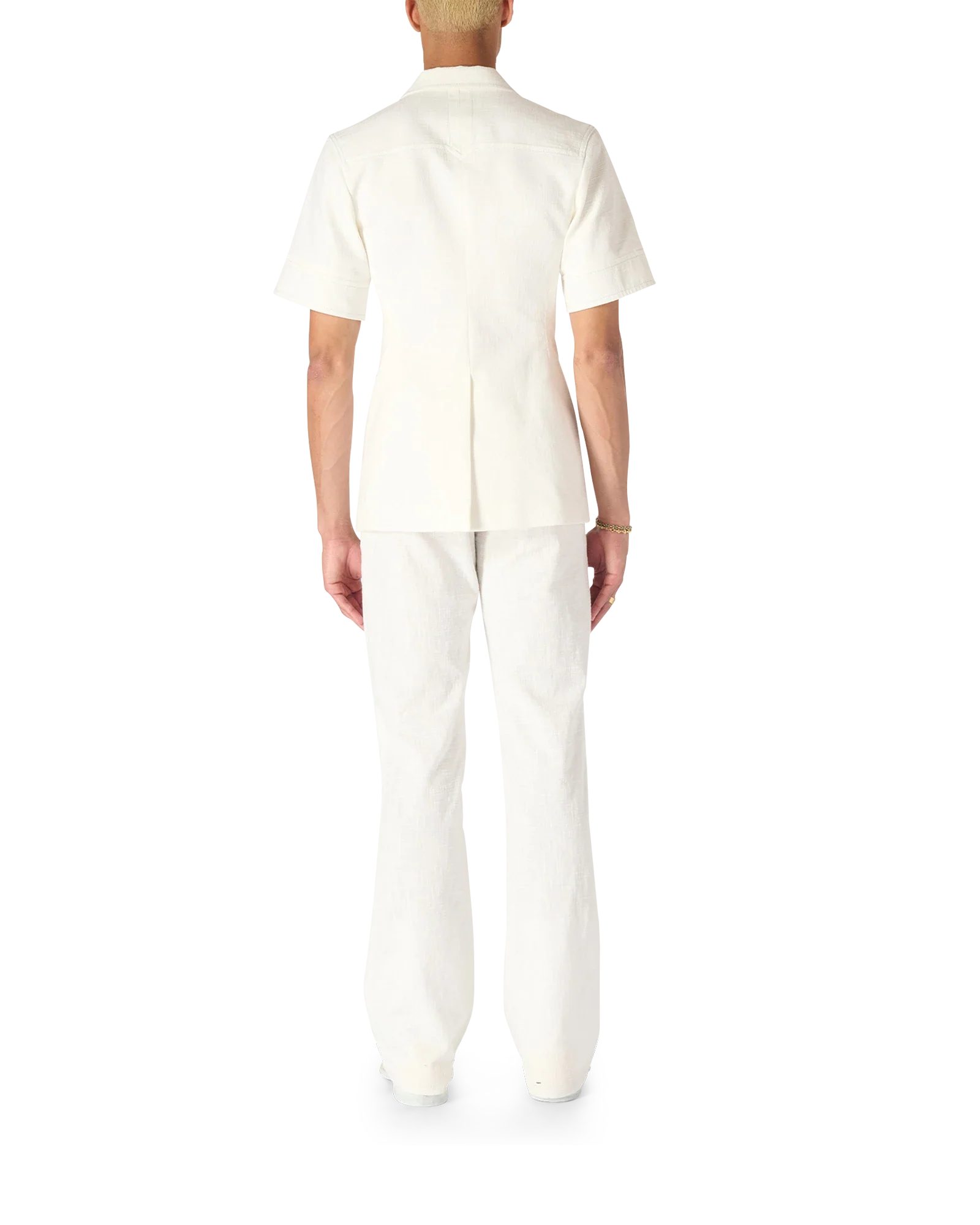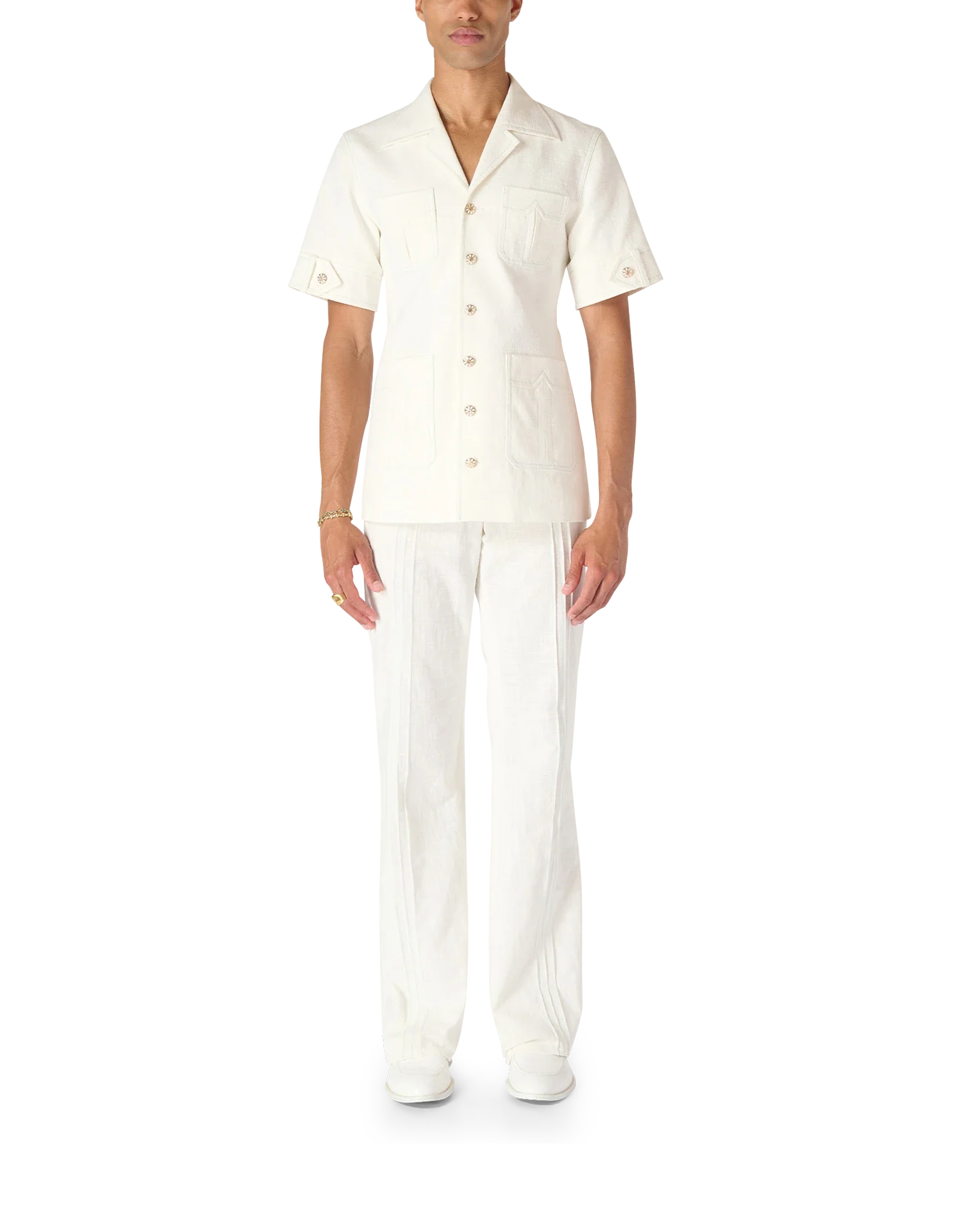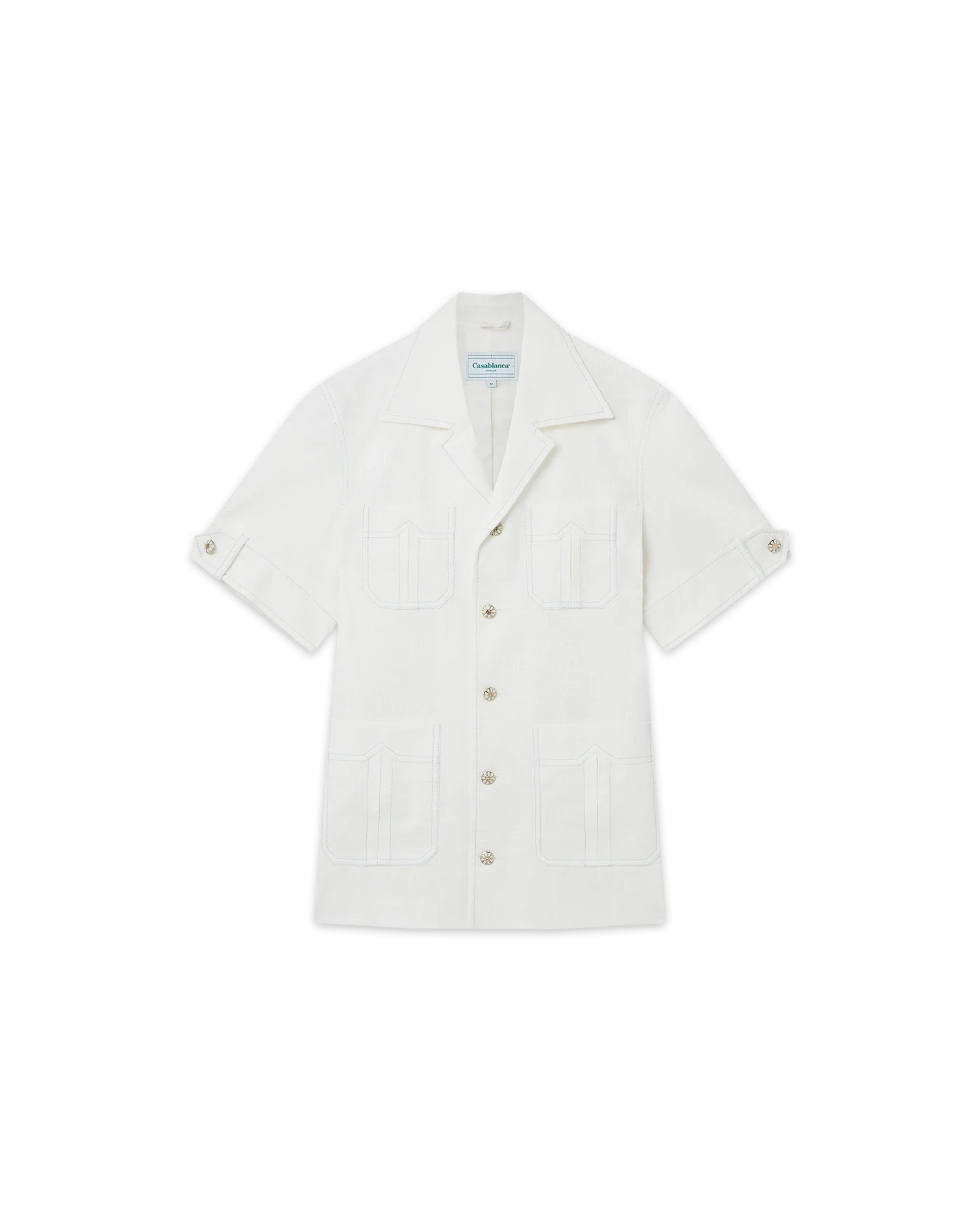 The short sleeve Safari Jacket is a fitted style incorporating Casablanca design codes and stitch detailing. Completed with an open collar. gold-rimmed front button closure and sleeve finishing.