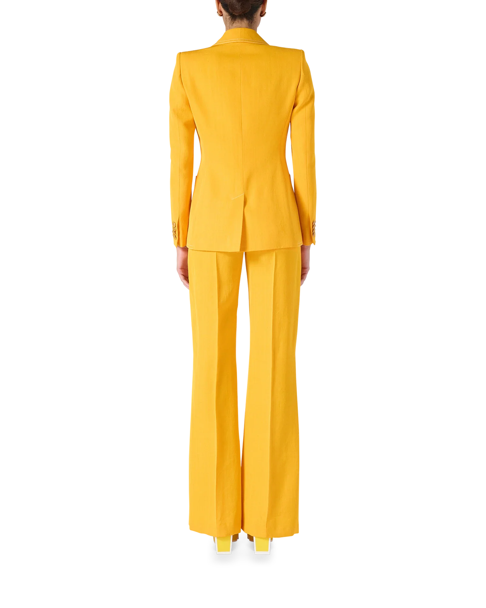 The citrus Single Breasted Blazer is a classic tailored jacket rendered in a vibrant. typically Casablanca yellow hue in viscose silk. The blazer is fastened with a single button and coordinates with matching trousers through pocket detailing at the hip.