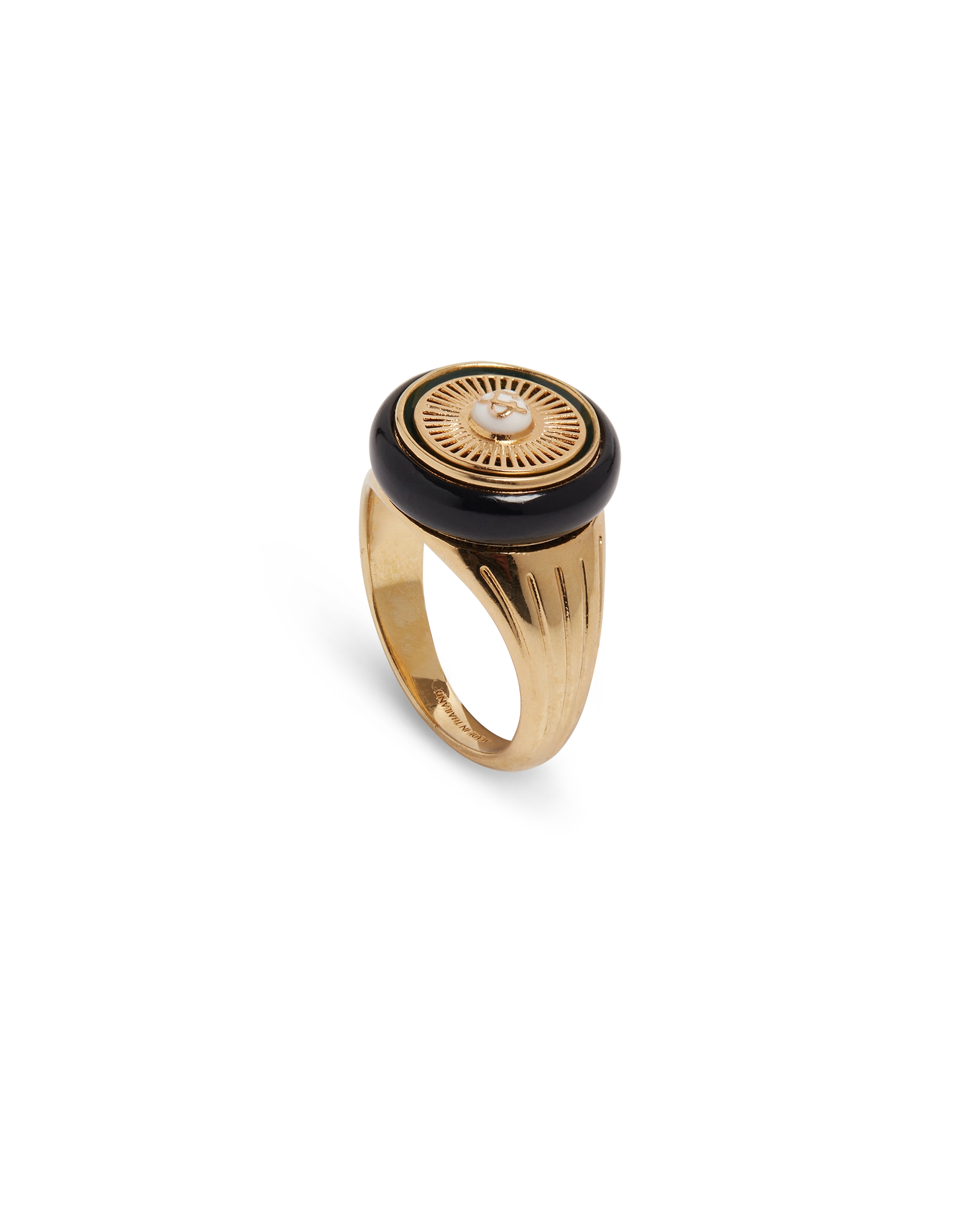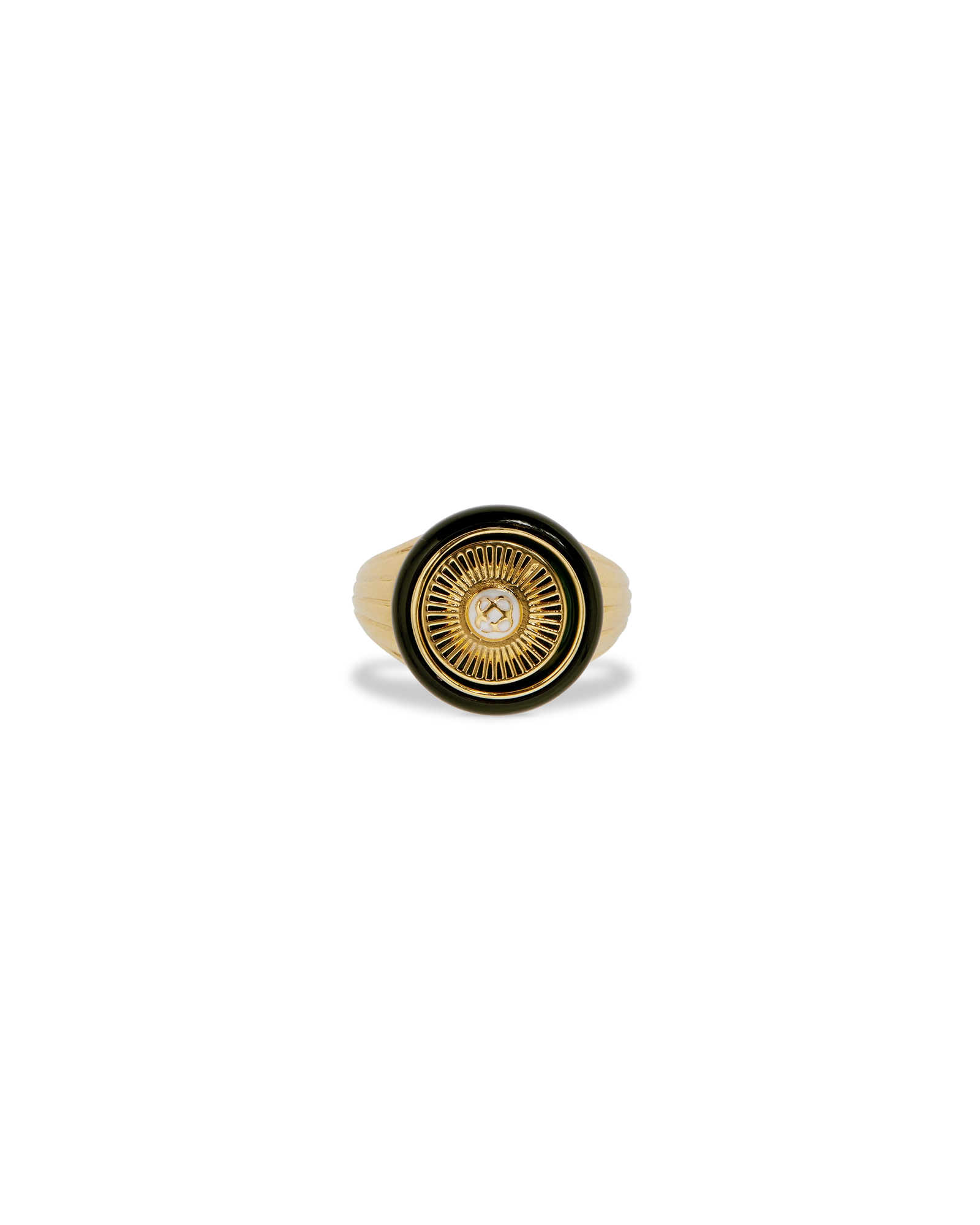 The spoke wheel ring is crafted from gold-plated brass and enamel. Completed with the house’s interlocking CC logo at the centre of the wheel-designed face. and lines engraved into the shanks.