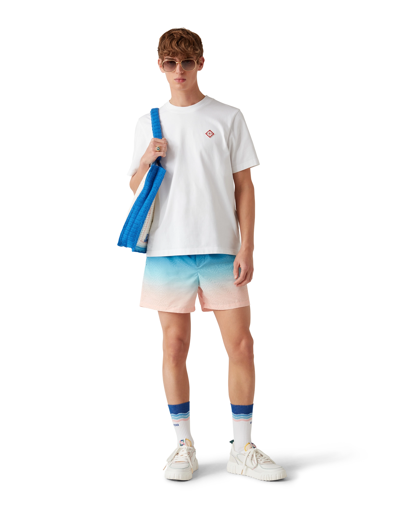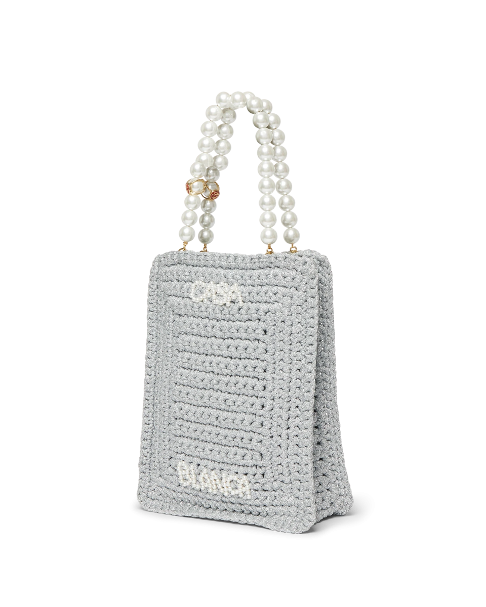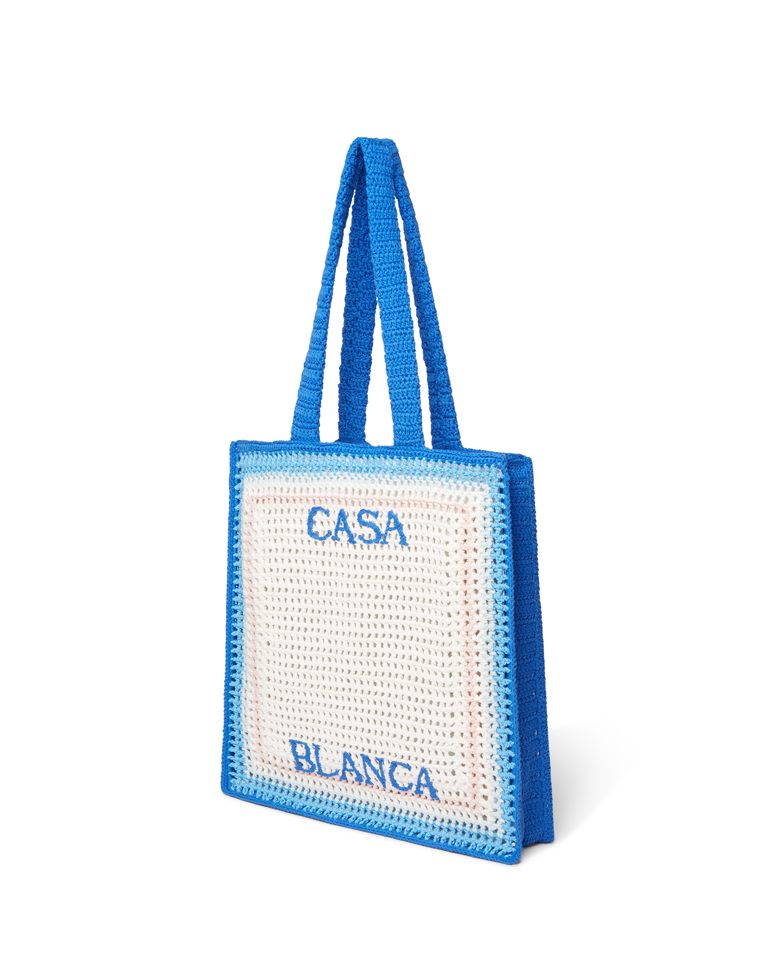 The stripe crochet bag is a knitted style crafted from crochet cotton fabric. and features a slouchy silhouette. Completed with an embroidered black logo and straps that allow the tote style to be worn over the shoulder or in the hand.