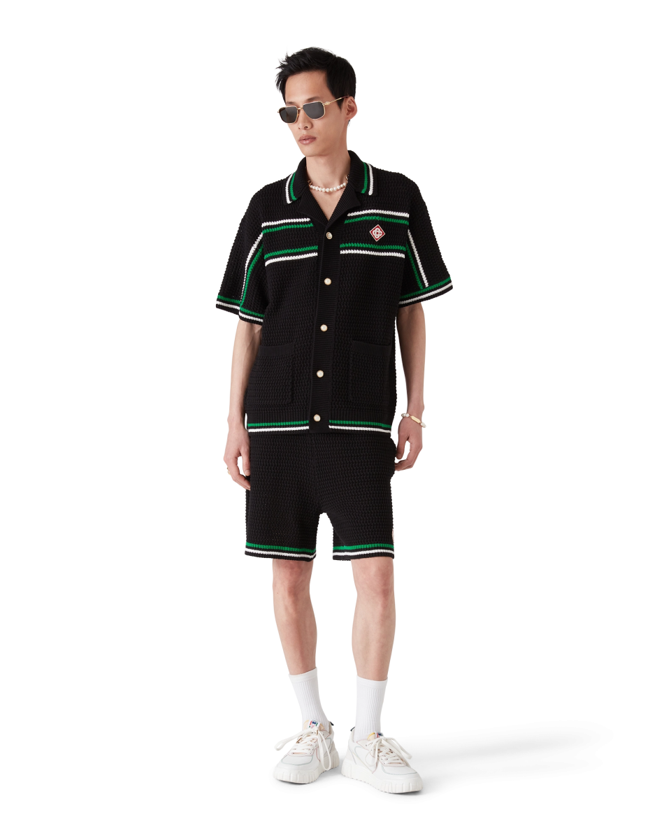 The stripe oversized polo shirt is a short-sleeve design crafted from stripe knitted fabric featuring the house’s signature diamond logo. Completed with signature gold rim pearl buttons. three-button placket. and rib cuffs. hem. collar and placket.