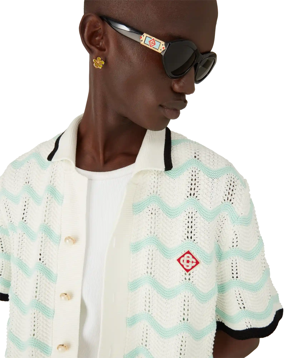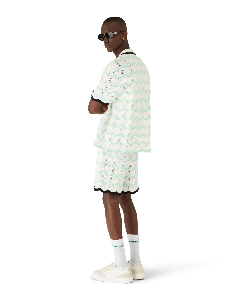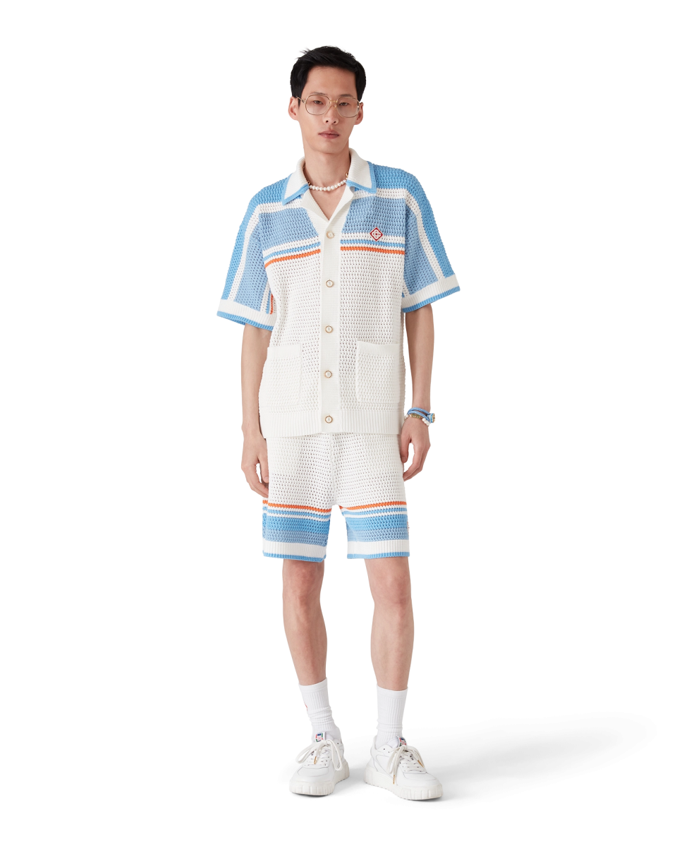 The striped mesh shorts are crafted from a knitted organic cotton fabric. inspired by the colours of the Nigeria flag and feature the house’s diamond logo patch. Completed with a ribbed waistband and hem. slanted side pockets and a back pocket with a zip closure.