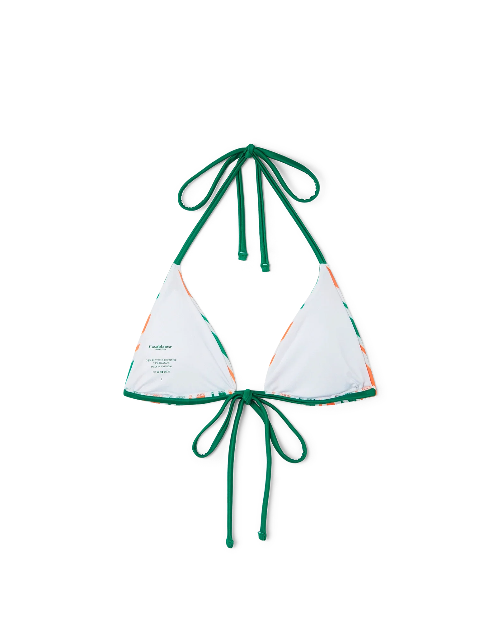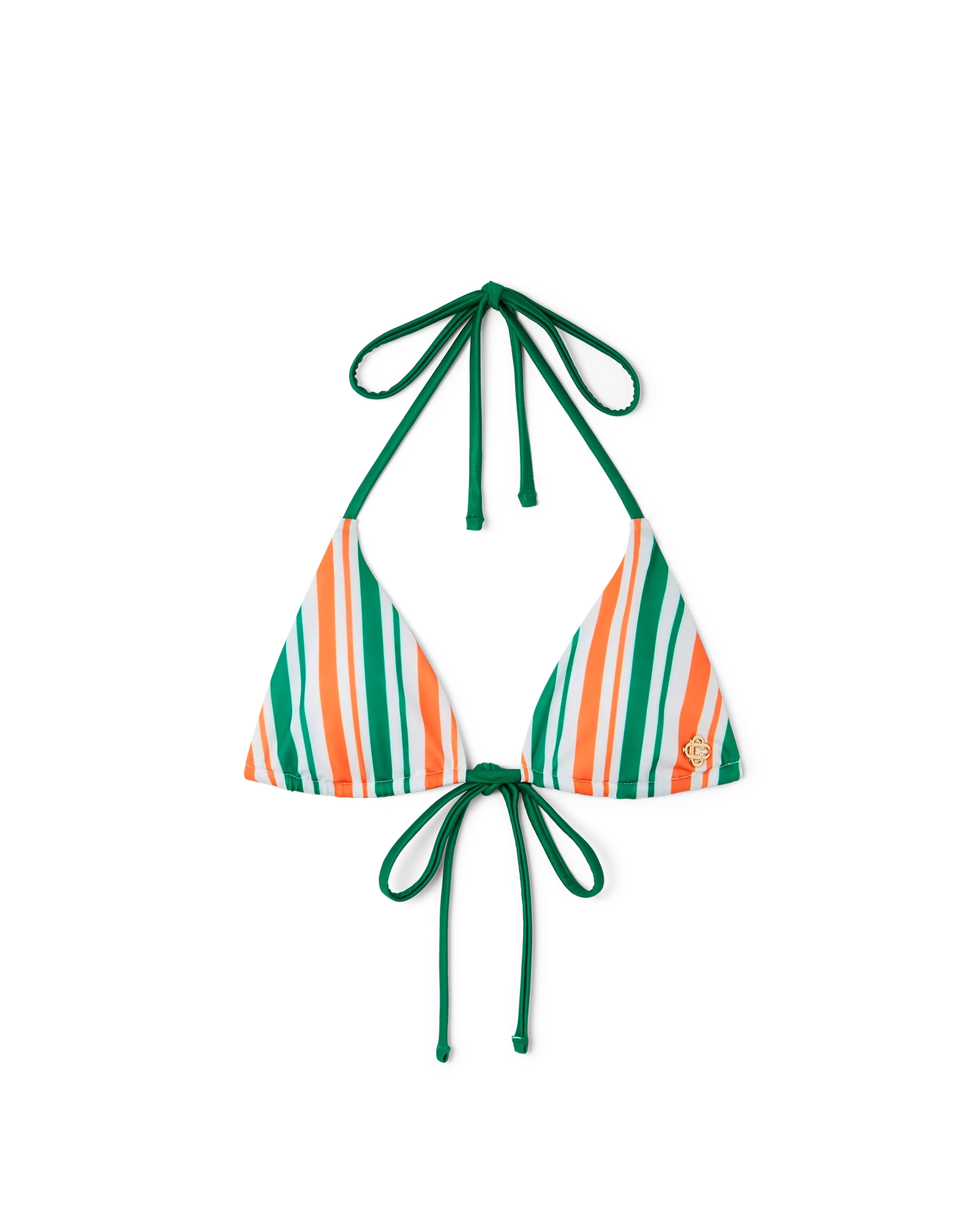 The striped string bikini top is a triangular-shaped style featuring seasonal colour codes with green string fastening at the neck and back. This piece is completed with removable padding and is intended to be worn with its coordinating bottoms.
