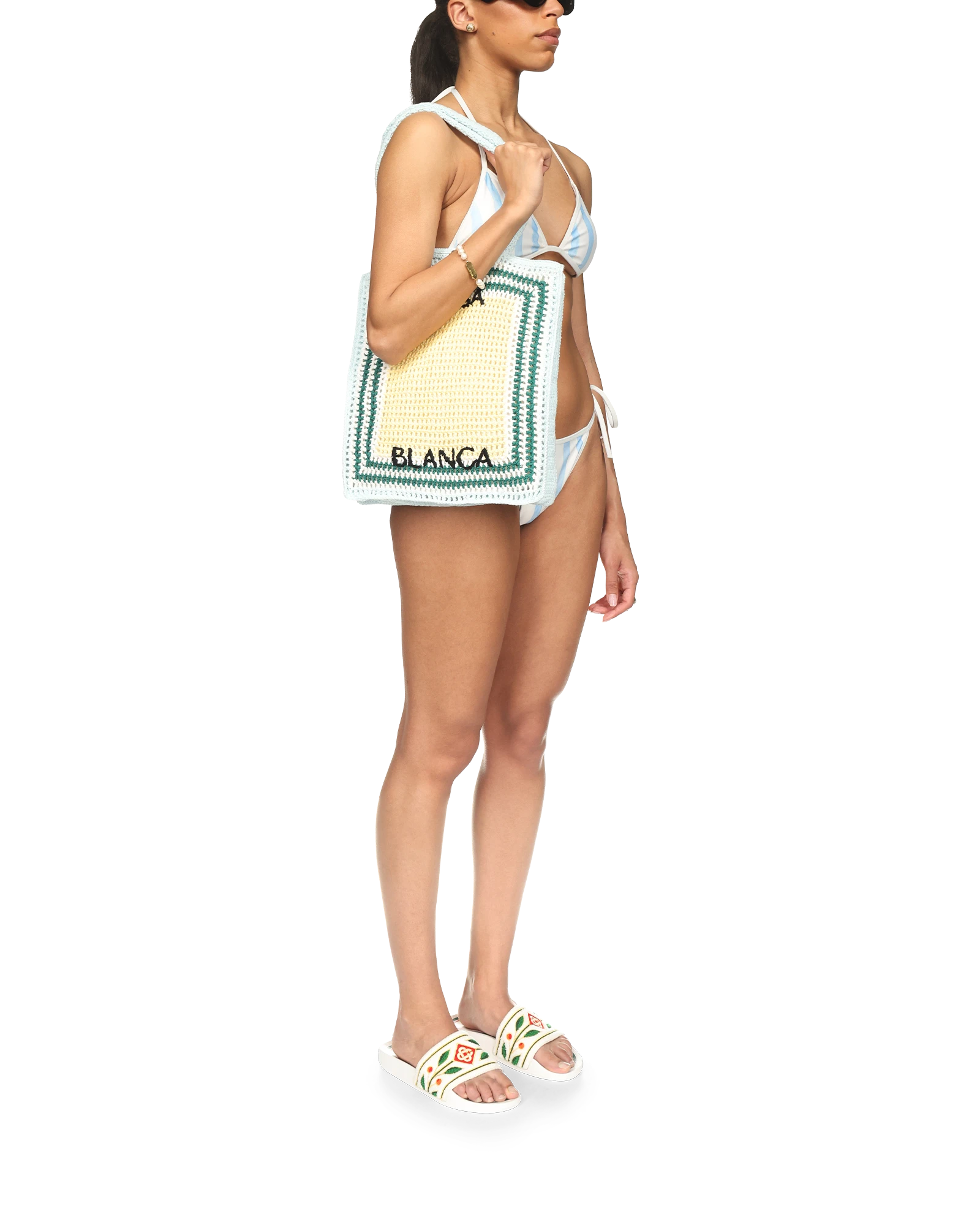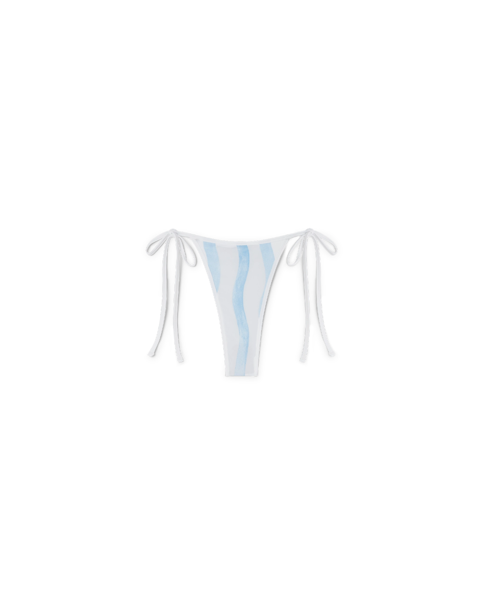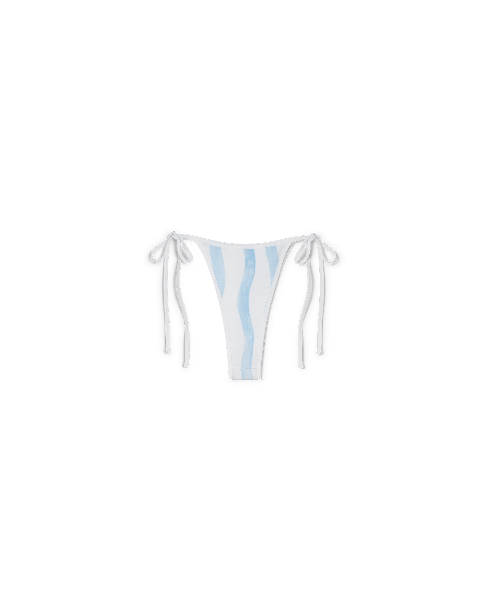 The Wave bikini bottom is a blue and white wavy stripe design that fastens at the hip with white strings. Crafted from a poly-blend fabric. this piece features white trimmings and is intended to be worn with its coordinating bikini top.