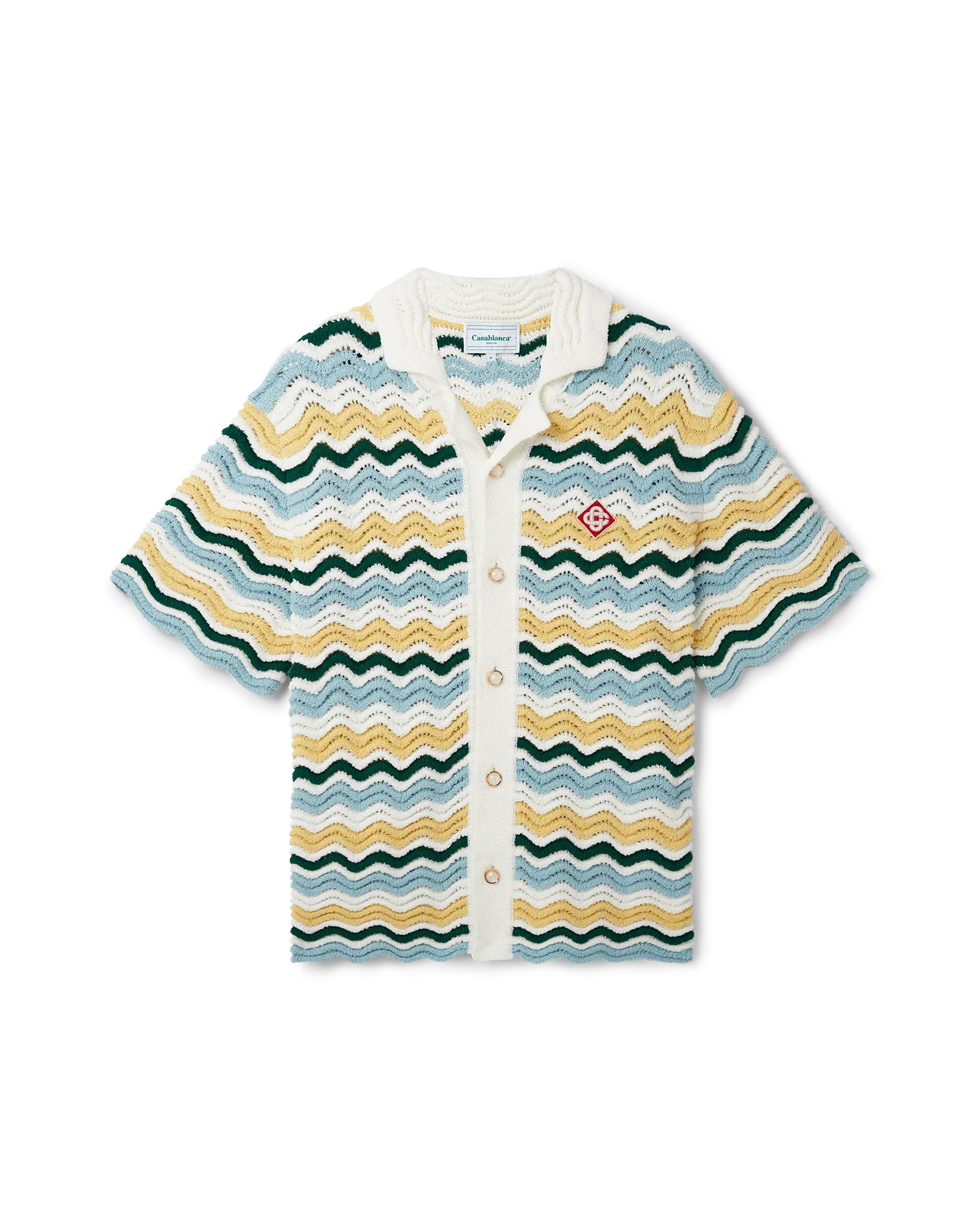 The wavy boucle shirt is a signature Casablanca style crafted from a soft textured open-weave crochet fabric. Finished with our signature gold rim pearl button closure. open collar. short sleeves and Casablanca Paris branded label – designed to be worn with a classic Fits.